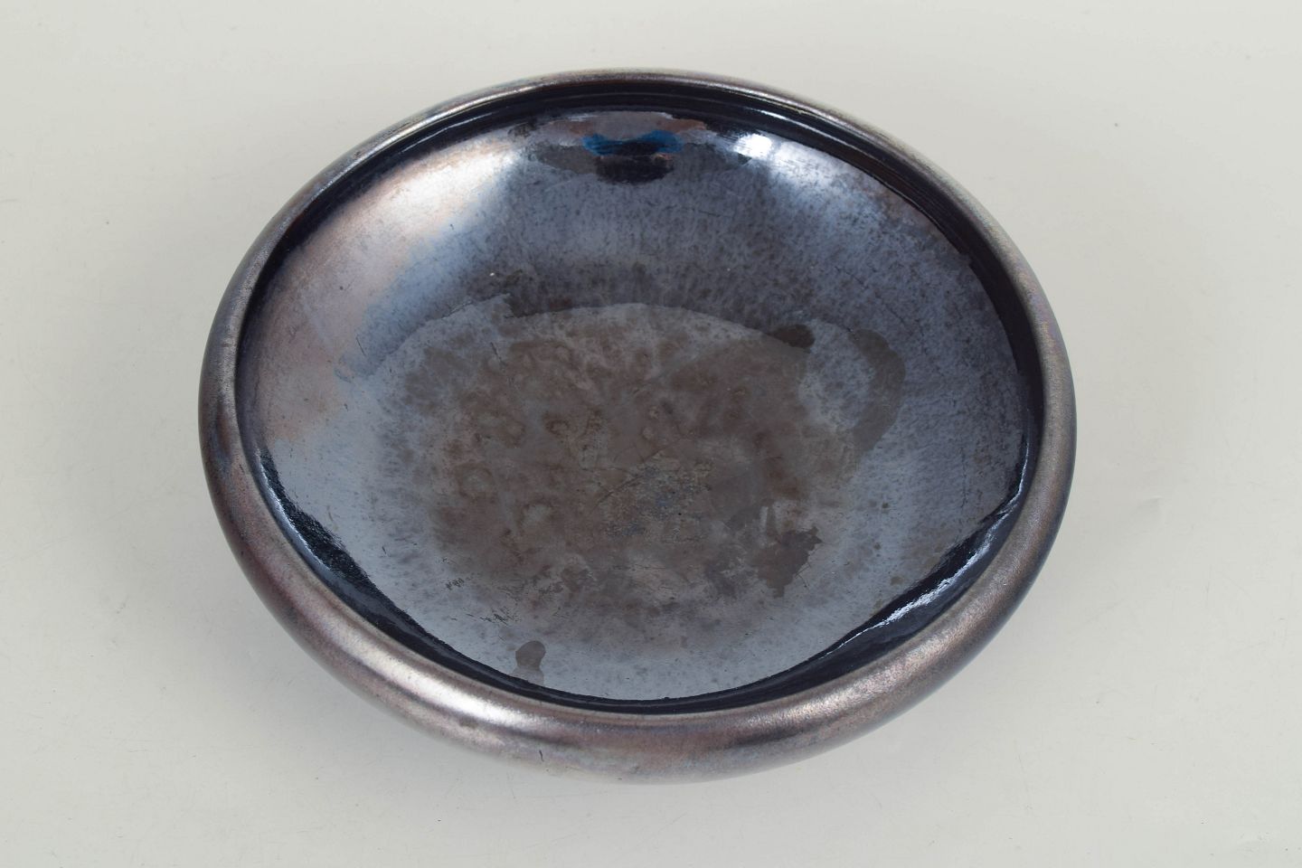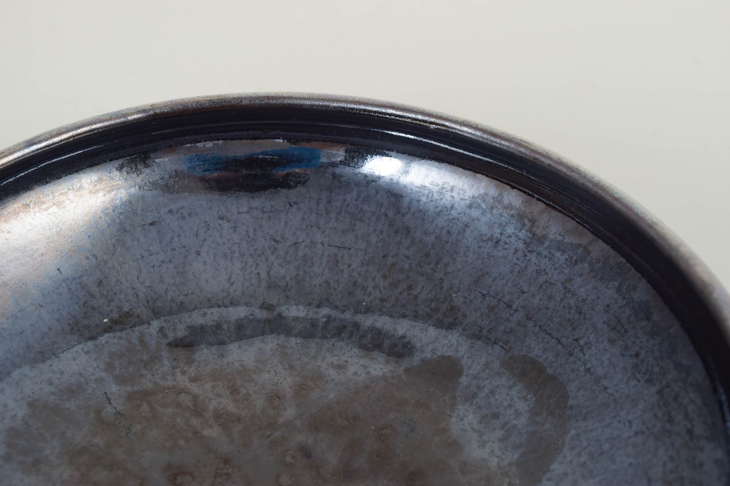 Dekorativ skål i stentøj med enkel, lav form og karakteristisk lustreglasur i mørke nuancer med fine spil i overfladen. Et klassisk eksempel på Hammershøis stilrene formsprog og sikre glasurarbejde fra 1930’erne. Stemplet i bunden.