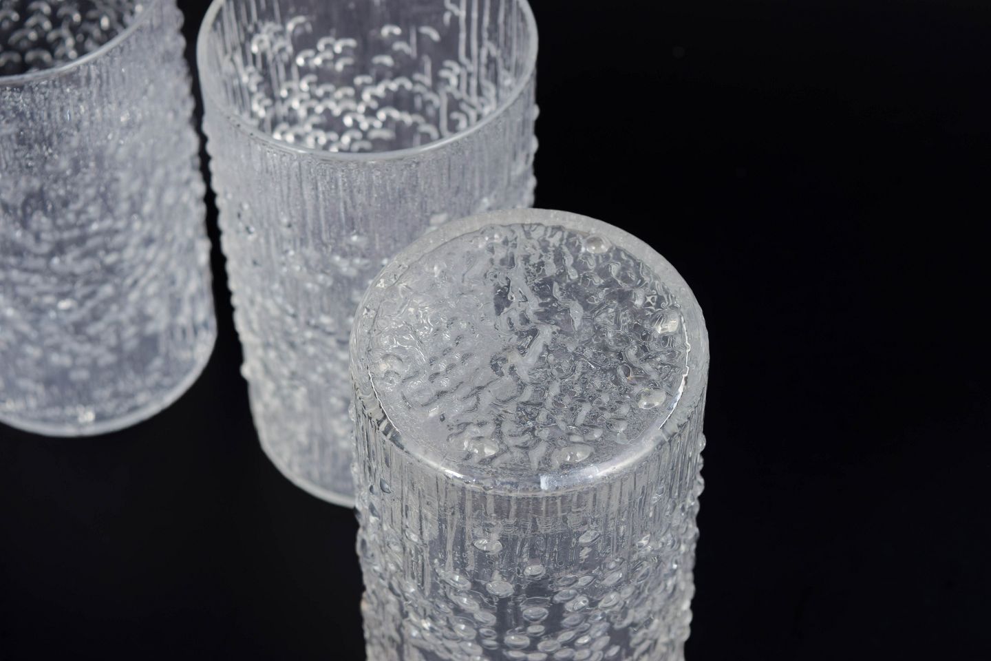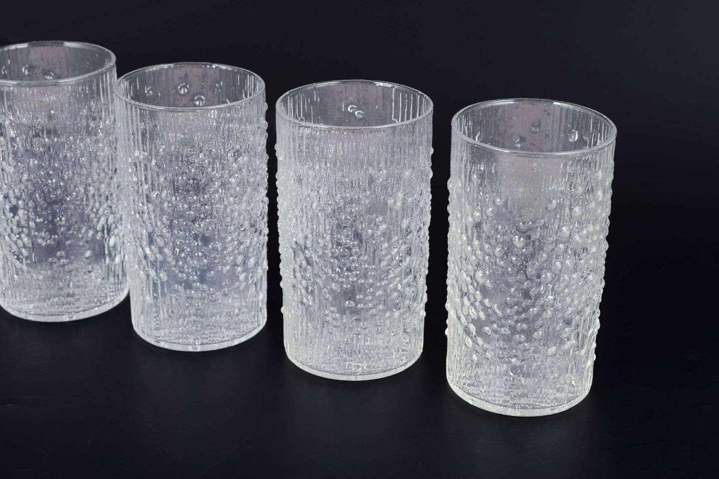 Set of five drinking glasses in pressed glass featuring a distinctive organic texture and relief pattern that creates a lively interplay of light across the surface. The design is a classic example of Finnish glass design from the period. Hopla model in clear glass.