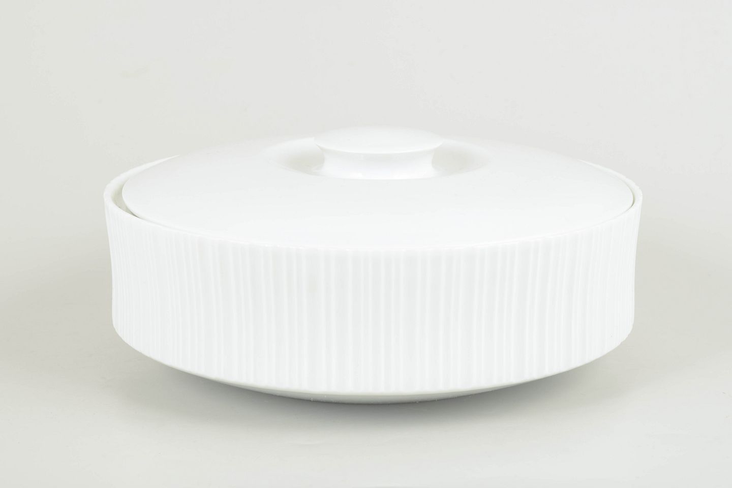 Rund skål med låg i porcelæn med lodrette rifler og et stramt, funktionalistisk formsprog, typisk for Tapio Wirkkalas arbejde for Rosenthal i 1980’erne.