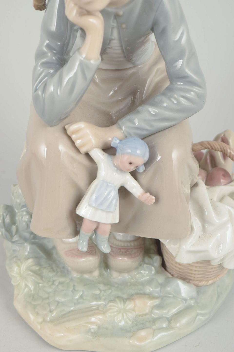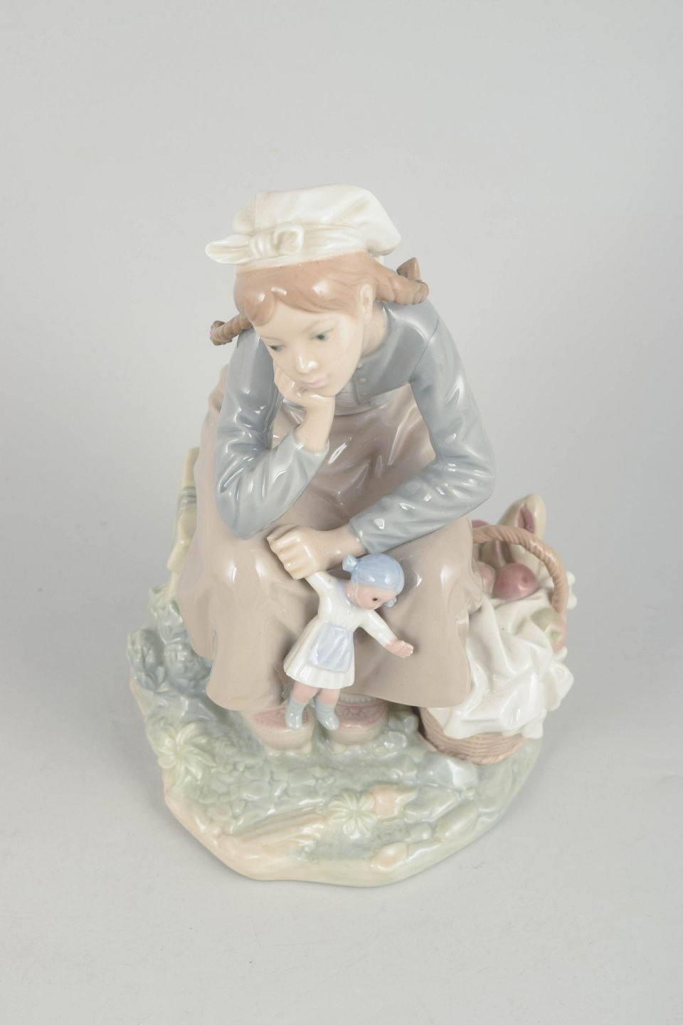 Fin figur i porcelæn forestillende en eftertænksom pige siddende med en dukke ved sin side samt en kurv. Udført i bløde pastelfarver med karakteristisk glasur og detaljerigdom.