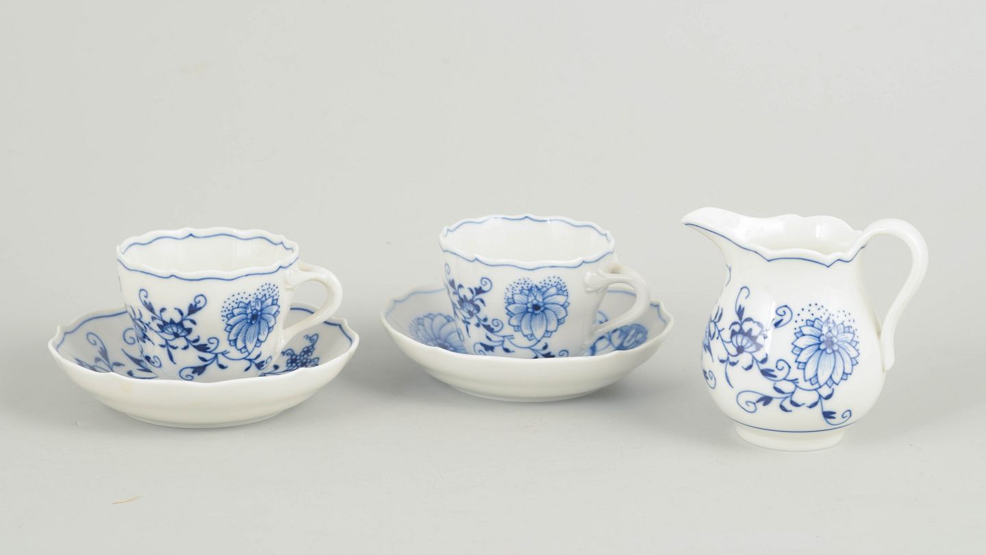 Sæt bestående af to espressokopper med tilhørende underkopper samt flødekande i porcelæn med håndmalet blå dekoration i det klassiske løgmønster. Fremstillet hos Meissen i midten af 1900-tallet og markeret med Meissen krydssværd. Første og tredje sortering.