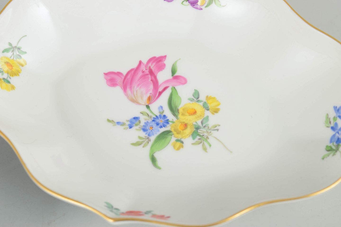 Sæt af to fade i porcelæn håndmalet med polykrome blomster og dekoreret med guldkant. Klassiske Meissen former med let bølget rand fra midten af det 20. århundrede. Begge mærket med Meissen krydssværd, hvoraf det ene er første sortering og det andet tredje sortering.