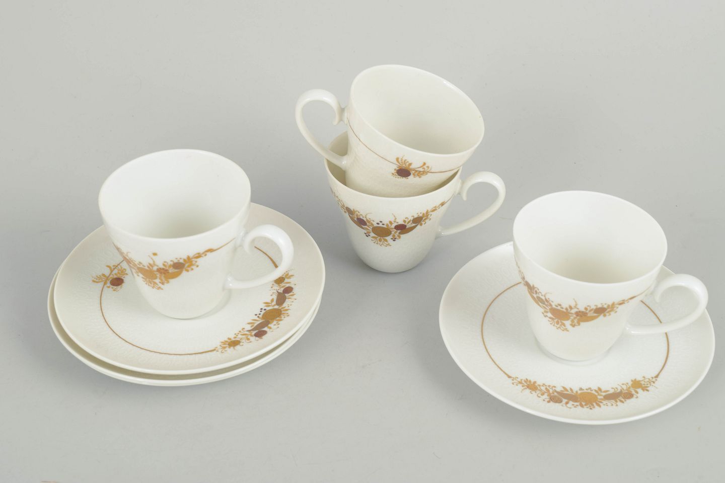 Sæt bestående af fire kaffekopper med tilhørende underkopper i porcelæn dekoreret med det karakteristiske blomsterornament fra Romanze-serien. Dekorationen fremstår i gyldne nuancer med fine detaljer og et elegant, romantisk udtryk, typisk for Wiinblads formsprog i 1970’erne.