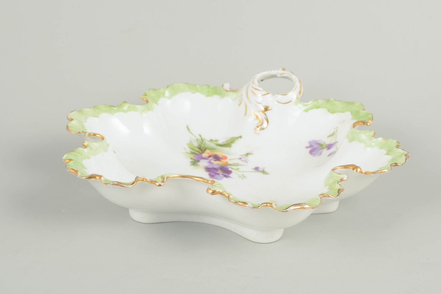 Dekorativ skål i porcelæn med bølget kant og gennembrudt greb, udsmykket med håndmalede blomster i lilla og grønne nuancer samt forgyldte detaljer, typisk for Rosenthals produktion i begyndelsen af det 20. århundrede.