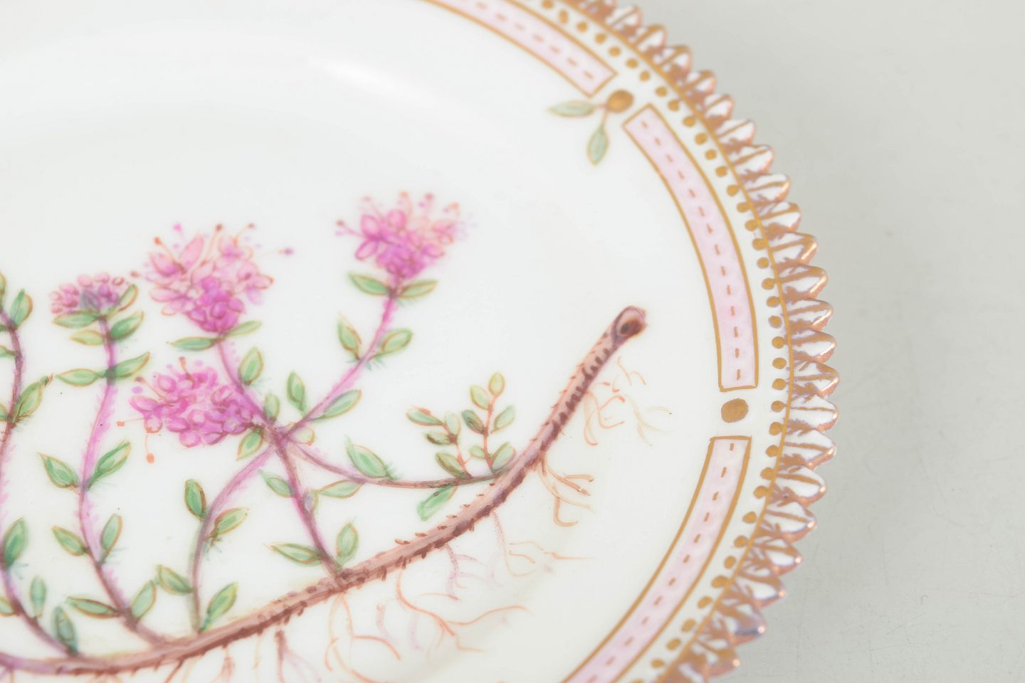 Hånddekoreret porcelænstallerken med botanisk motiv fra Flora Danica-serien, hjemmedekoreret, fint udført med forgyldt rand og detaljerig gengivelse af planter.