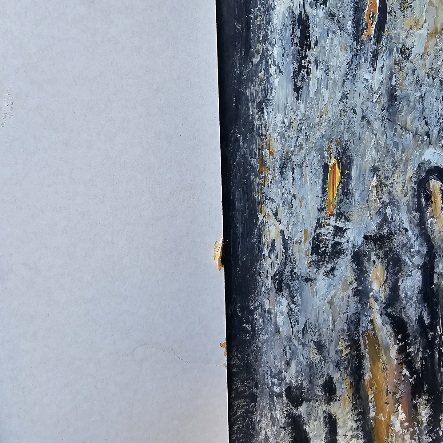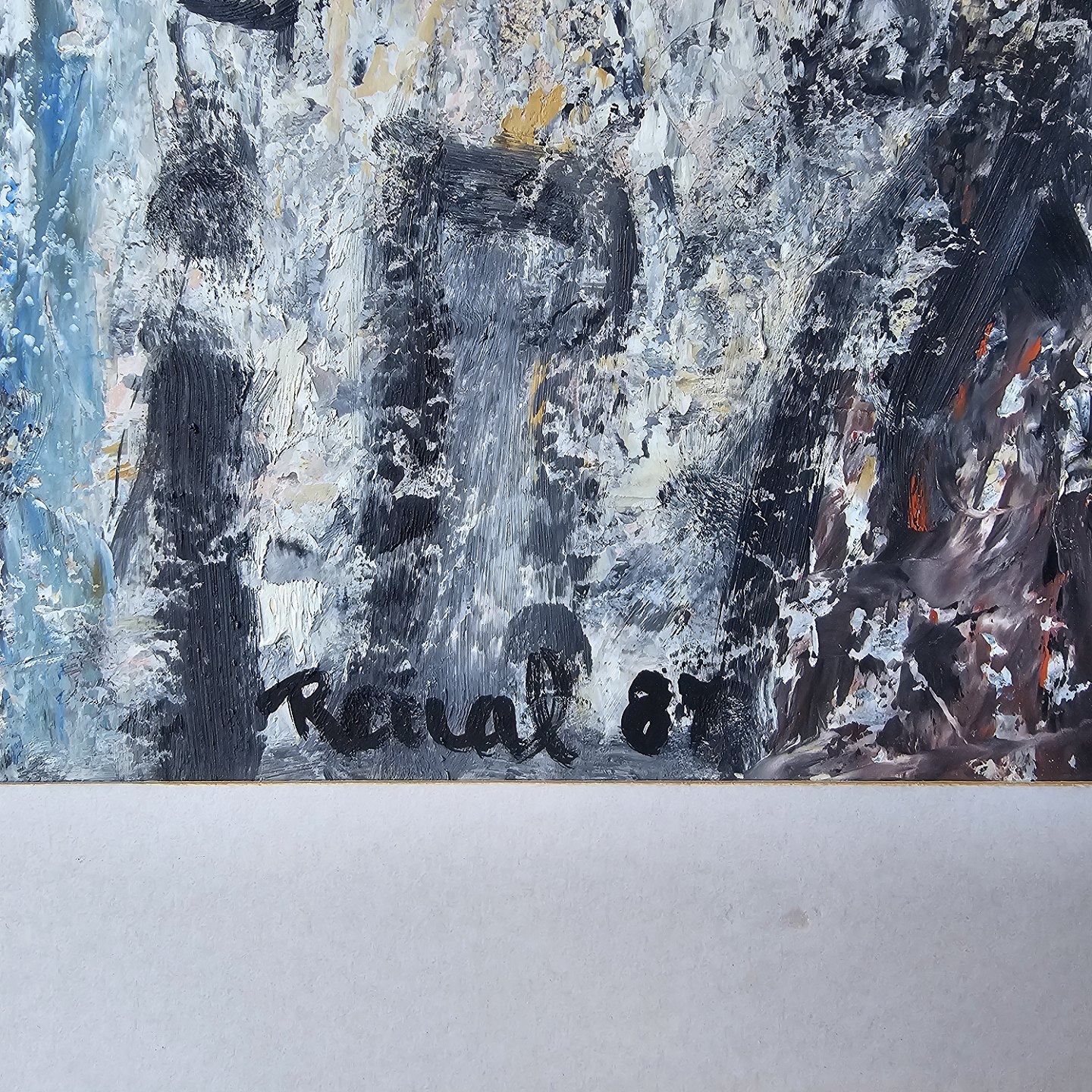 Oliemaleri på papir med abstrakt motiv af mennesker. Monteret i sølvfarvet ramme, dateret 1987