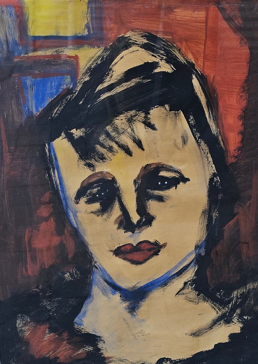 Oliemaleri på papir, kvindeportræt monteret i metalramme