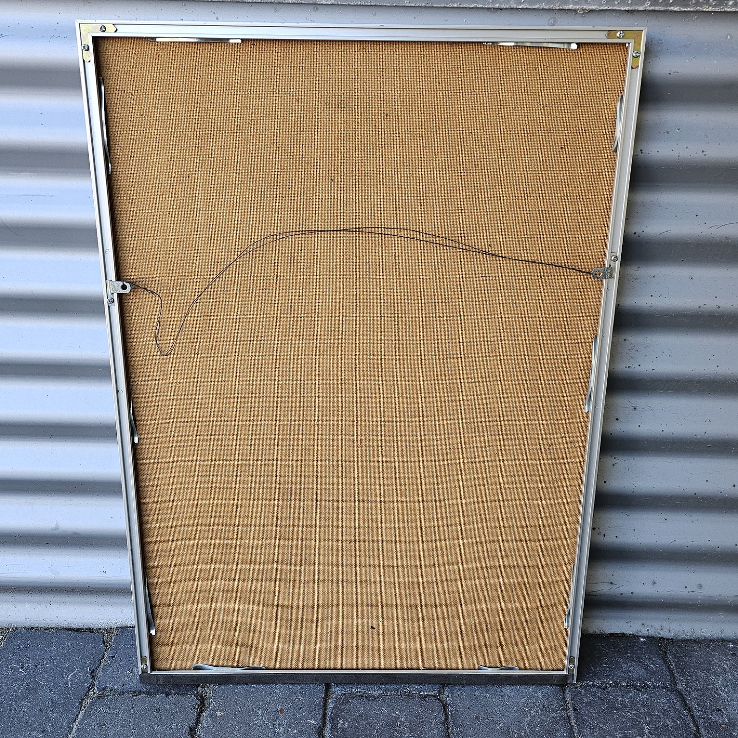 Litografi med abstrakt motiv i blå, turkis og grå monteret i metalramme. Nr. 12/46 og dateret 1989