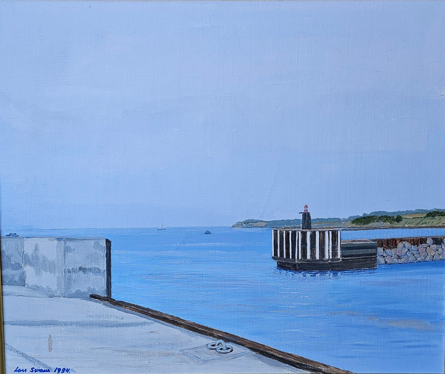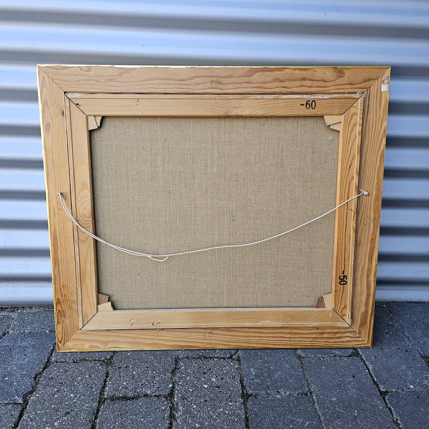 Oliemaleri på lærred med motiv af en havn monteret i guldmalet træramme