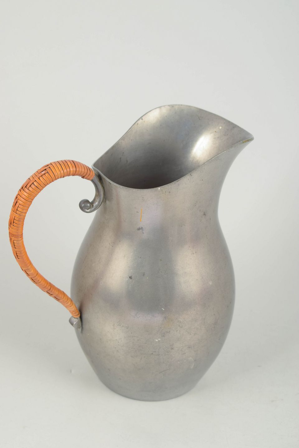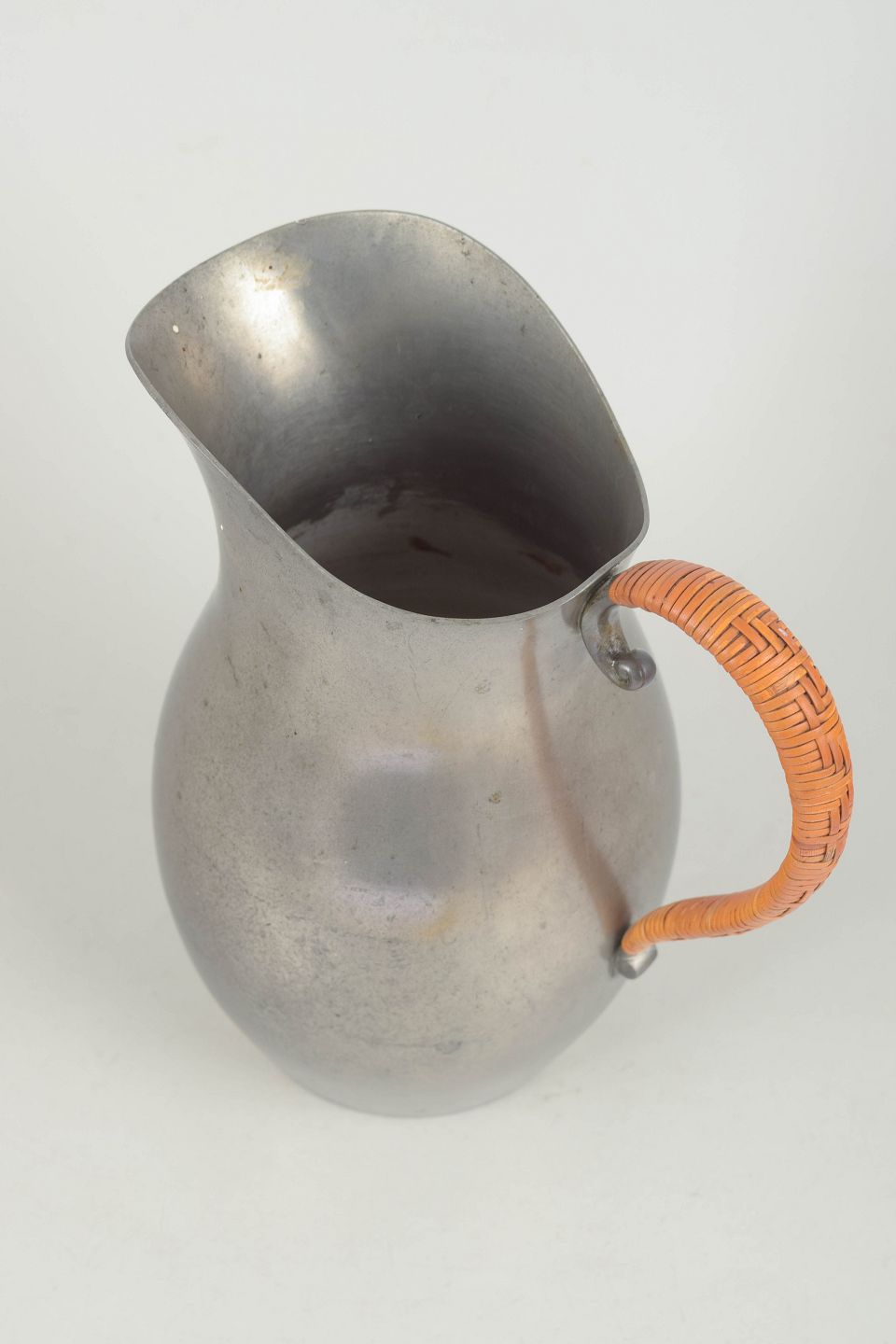 Stor kande i tin med flettet hank og blødt svunget korpus udført i et elegant art deco formsprog. Model 502.