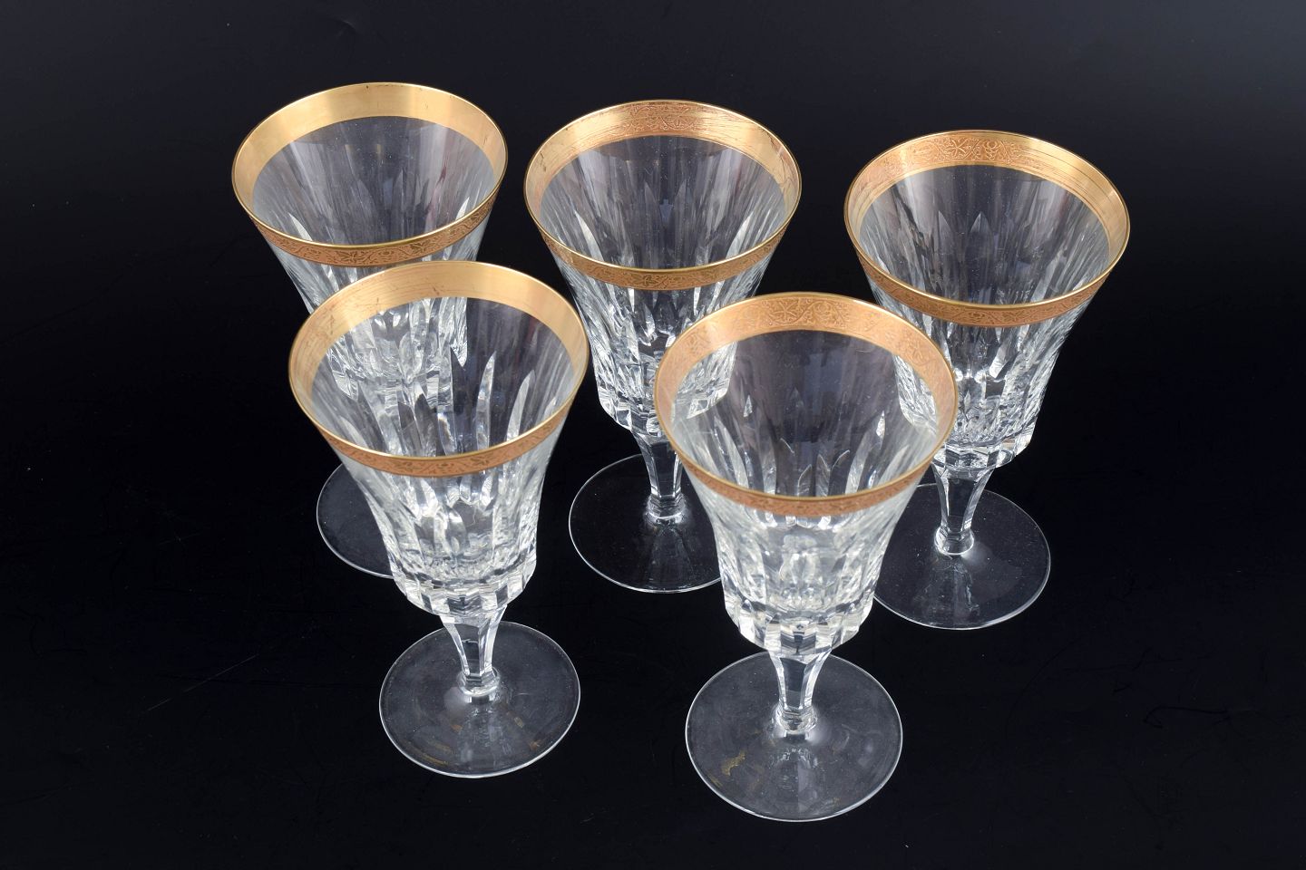 Elegante rødvinsglas i facetslebet krystal med dekoration i 24 karat guld langs kanten, udført i klassisk midten af det 20. århundrede stil.