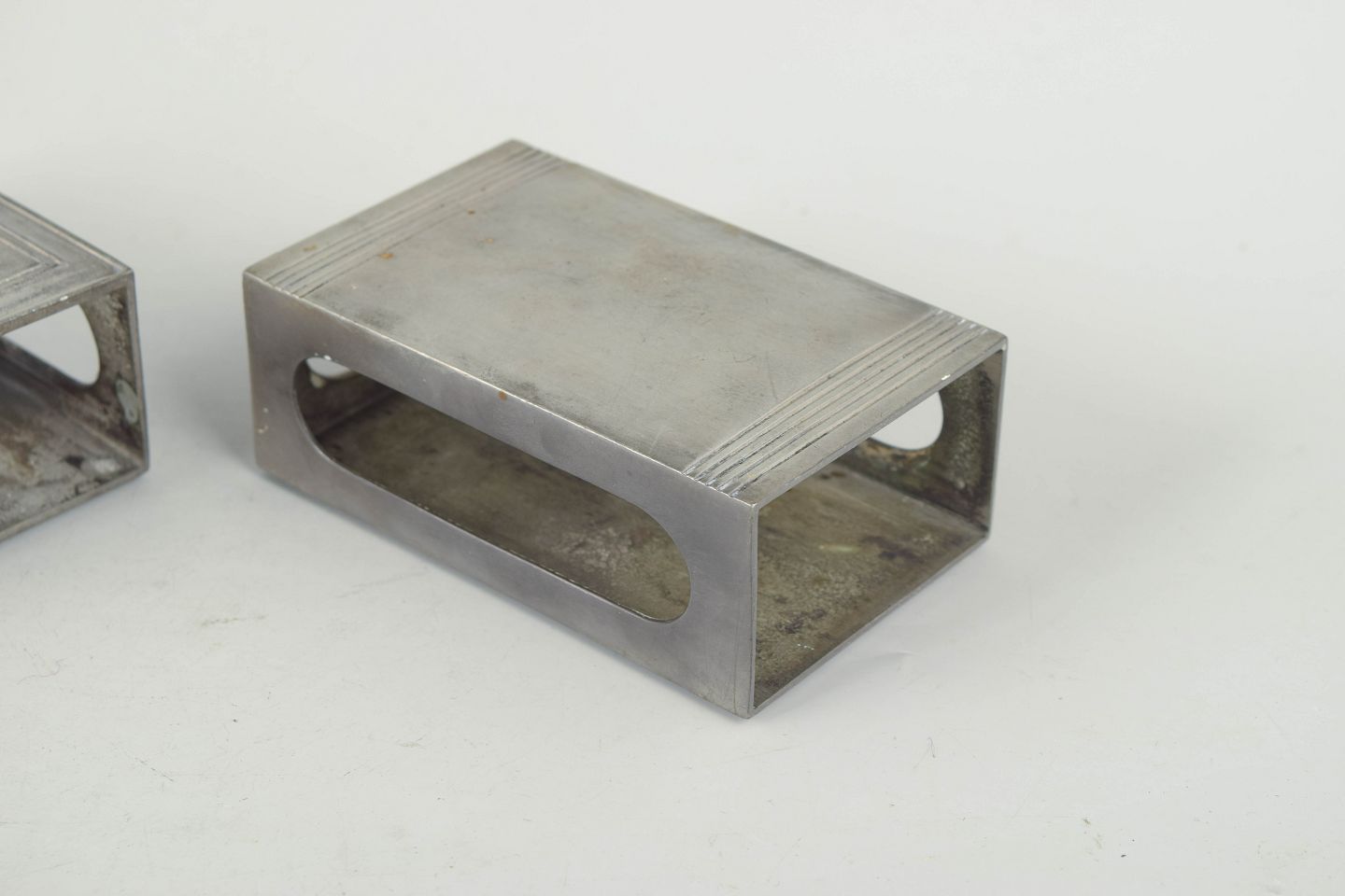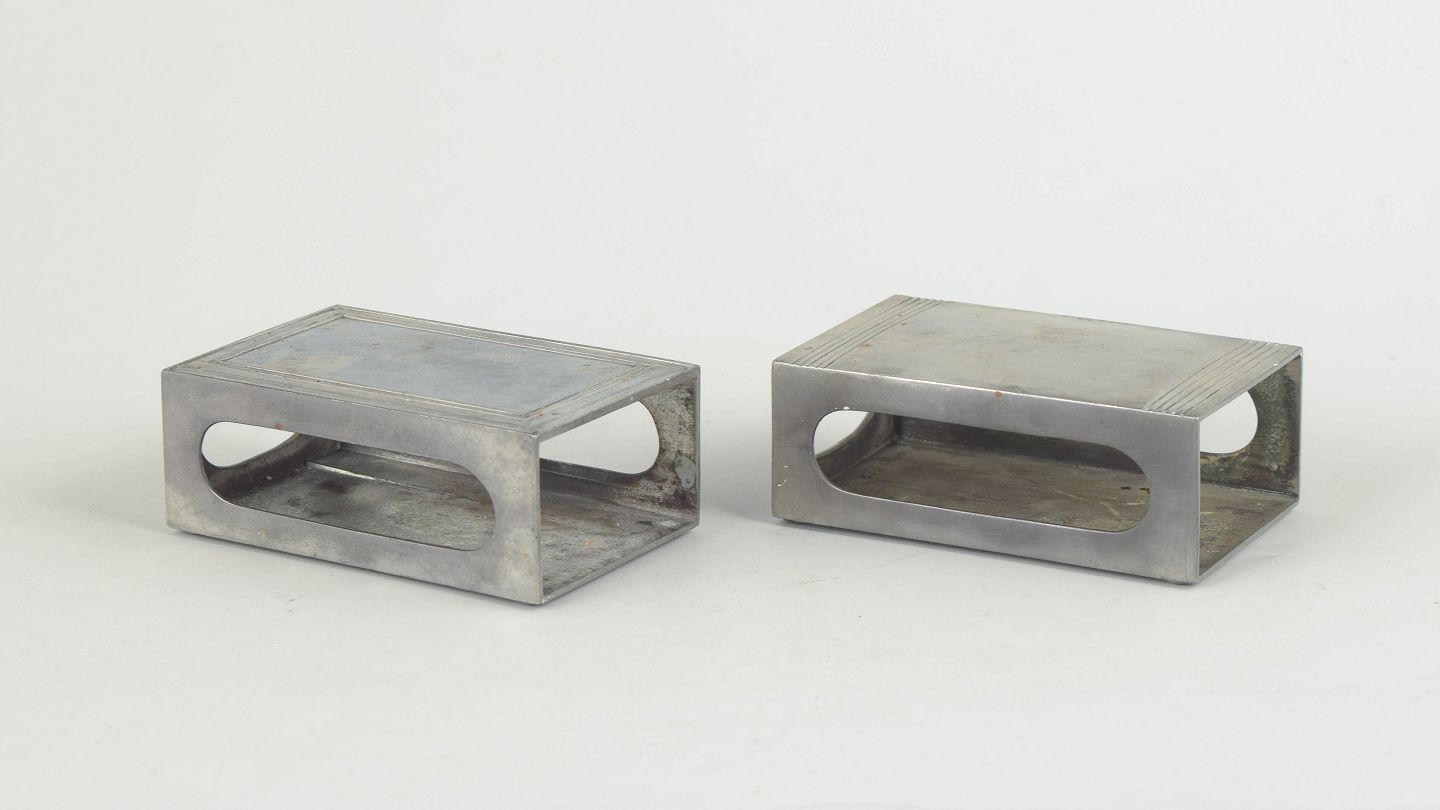 To tændstikæskeholdere i tin udført i et enkelt og stilrent art deco formsprog. Modeller 1496 og 1627.