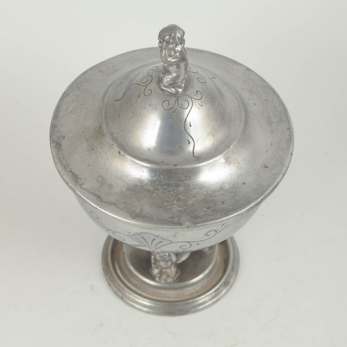 Dekorativ opsats i tin med låg og figurformet knop, udført med indgraveret dekoration og stående på tre små fødder.