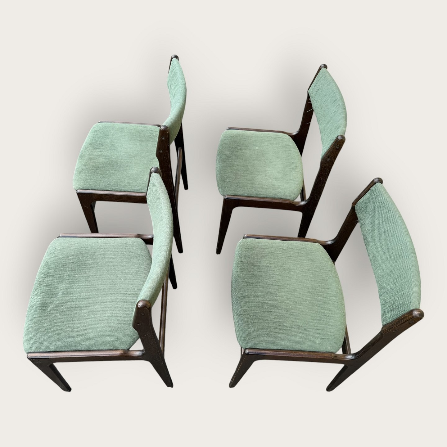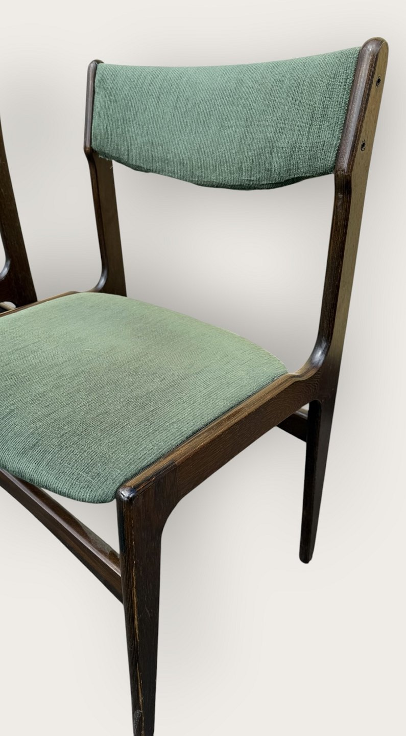 4 stole i mørkt bejdset træ, danish modern fra 1960'erne, stolene er stabile og i pæn brugt stand, men betrækket er plettet / løst.
