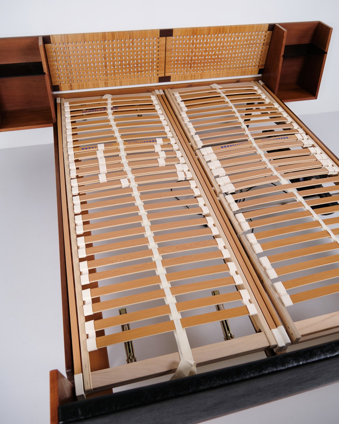 Model GE 701 dobbeltseng designet af Hans J. Wegner og fremstillet hos Getama i 1950’erne. Udført i fineret og massivt teaktræ. Gavle med sjeneflet og sort kunstlæder. Hovedgavl med integrerede sengeborde med hylder i sort glas samt underliggende hylde. Messingbeslag. Hans J. Wegner samarbejdede gennem mange år med Getama og udviklede flere møbler i teak til boligindretning og soveværelse.