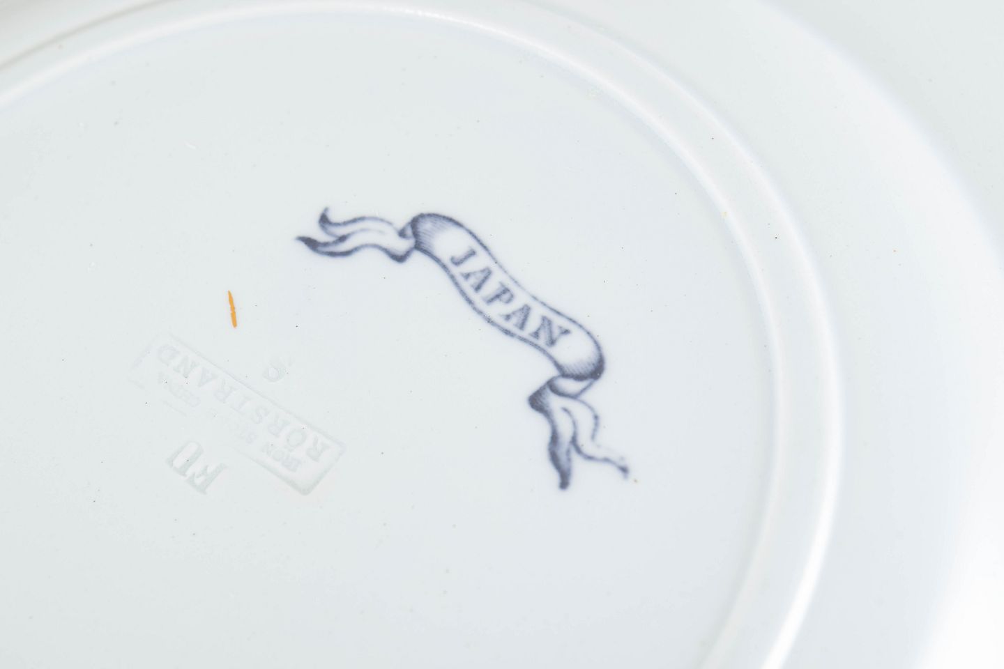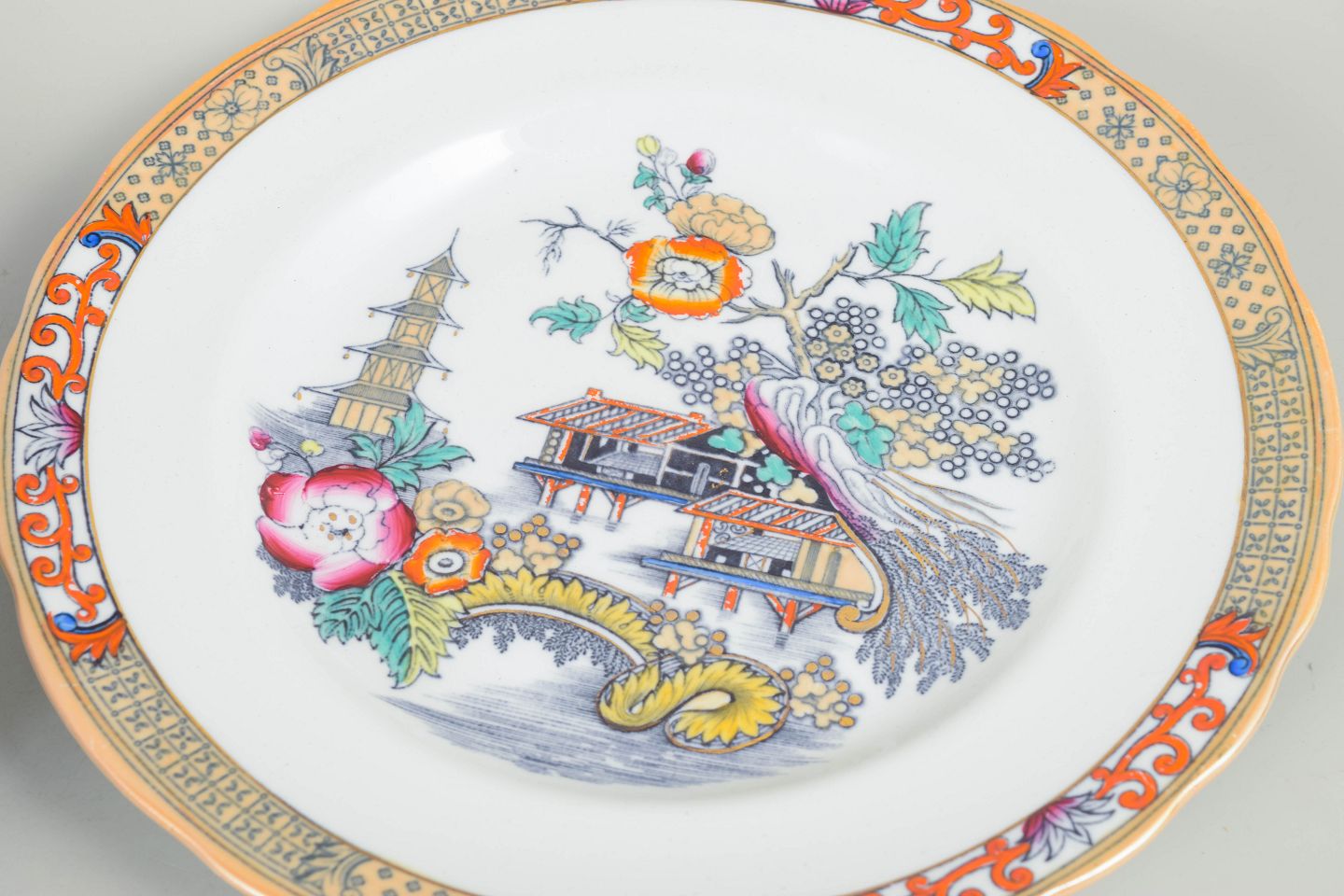 Middagstallerkener i fajance med orientalsk inspireret dekoration i polykrome farver og detaljerig bemaling i japansk stil, karakteristisk for Rörstrands japanismeproduktion fra begyndelsen af 1900-tallet.
