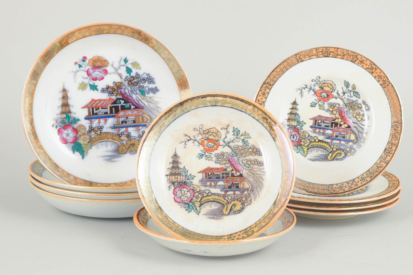 Flade og dybe tallerkener i fajance med orientalsk inspireret dekoration i polykrome farver og detaljerig bemaling i japansk stil, karakteristisk for Rörstrands japanismeproduktion fra begyndelsen af 1900-tallet.