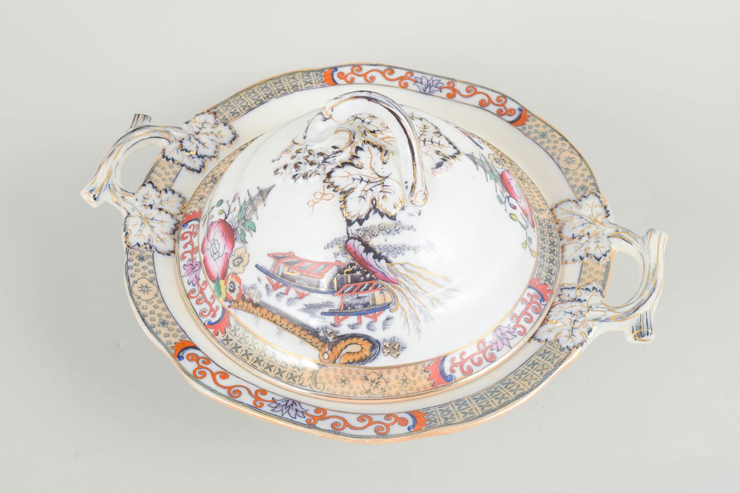 Terrin i fajance med orientalsk inspireret dekoration i polykrome farver og detaljerig bemaling i japansk stil, karakteristisk for Rörstrands japanismeproduktion fra begyndelsen af 1900-tallet.