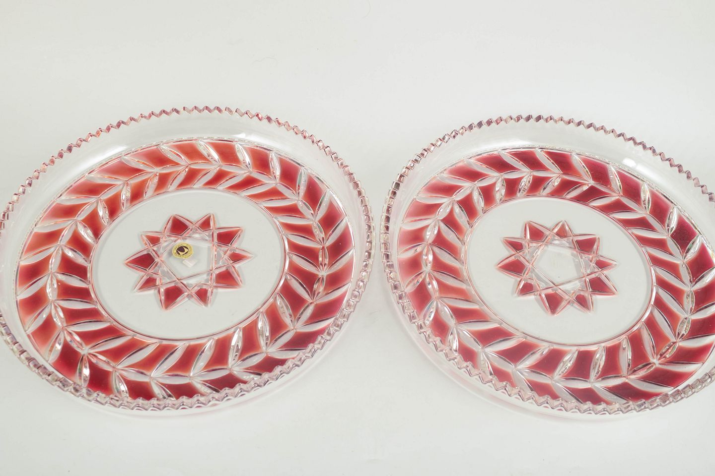 Pressede og slebne glasfade i klart og rosa tonet krystal med geometrisk stjernedekor og facetslebne kanter.