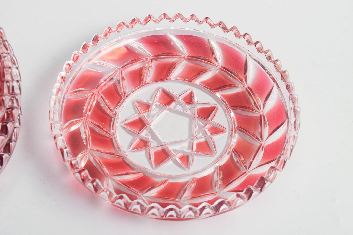 Pressede og slebne glasfade i klart og rosa tonet krystal med geometrisk stjernedekor og facetslebne kanter.