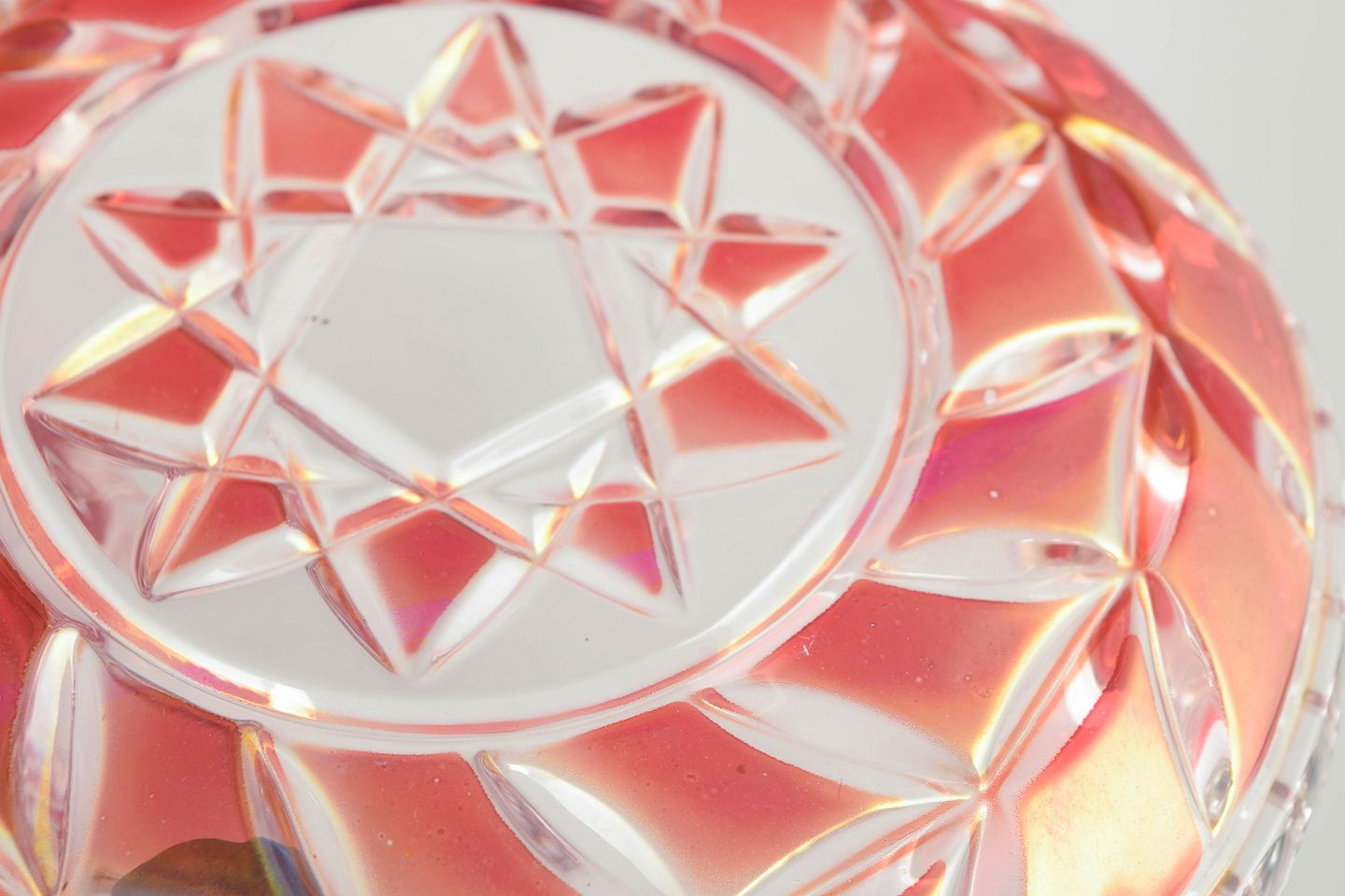 Pressede og slebne glasfade i klart og rosa tonet krystal med geometrisk stjernedekor og facetslebne kanter.