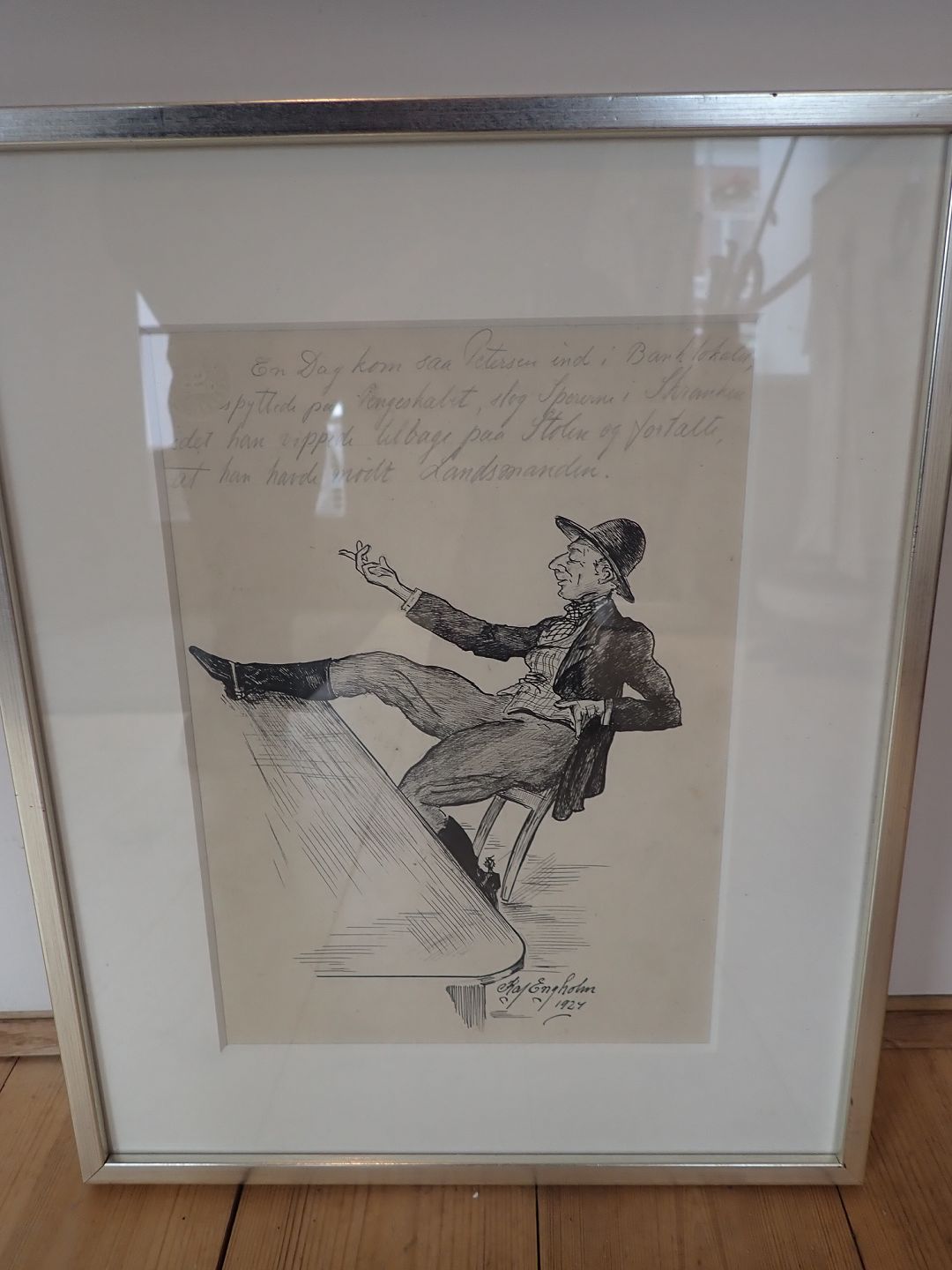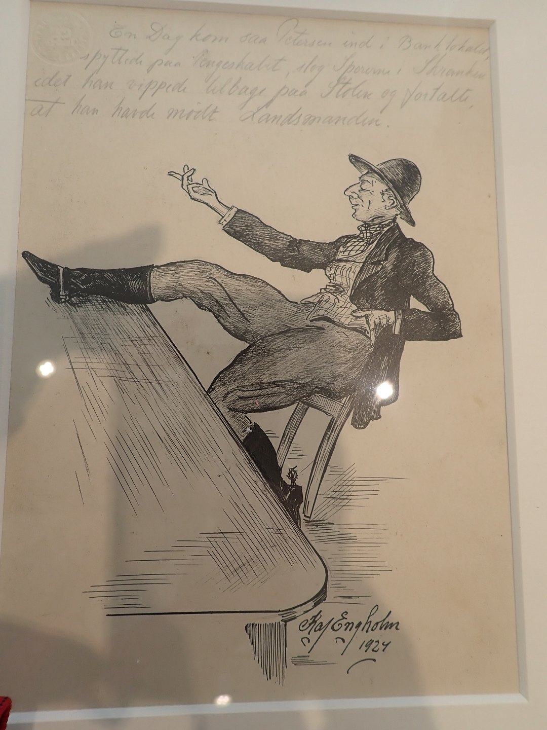 Indrammet original signeret Kaj Engholm 1924 (1906 - 1988) - tush tegning med hans egen blyantstekst: "En Dag kom saa Petersen ind i Banken, spyttede på Pengeskabet, slog Sporerne i Skranken idet han vippede tilbage paa Stolen og fortalte, at han havde mødt Landsmanden". Størrelse:17,5 x 24,5. I fin stand.