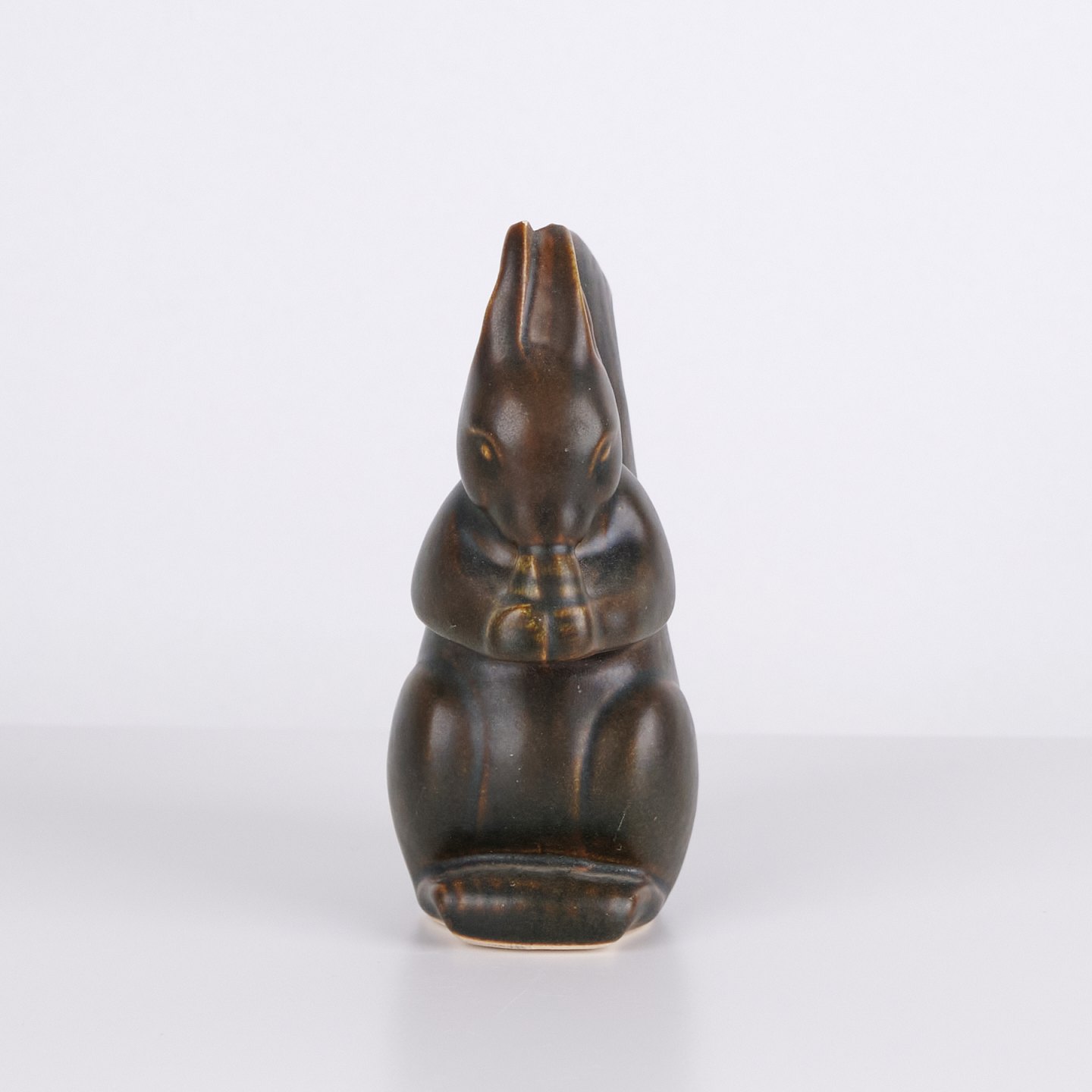 Keramisk egernfigur af Knud Basse udført i mørk glasur med varme brune nuancer. Figuren viser et siddende egern med nød og fremstår med markante organiske linjer, som kendetegner dansk studiokeramik fra perioden. Knud Basse figurer er kendte samlerobjekter inden for dansk dyrekeramik.