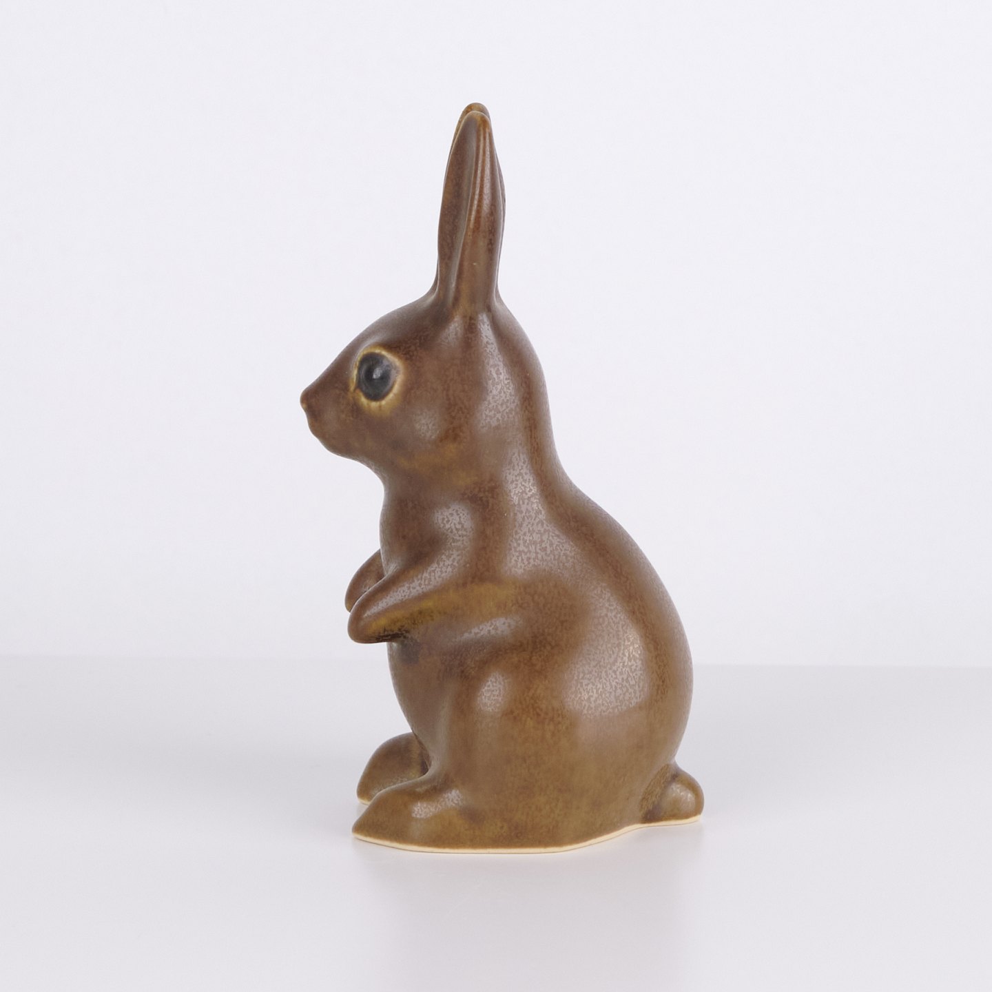 Stor harefigur af Knud Basse udført i brun glaseret keramik. Figuren er modelleret i opret siddende form med lange ører og fine håndmalede øjne.
