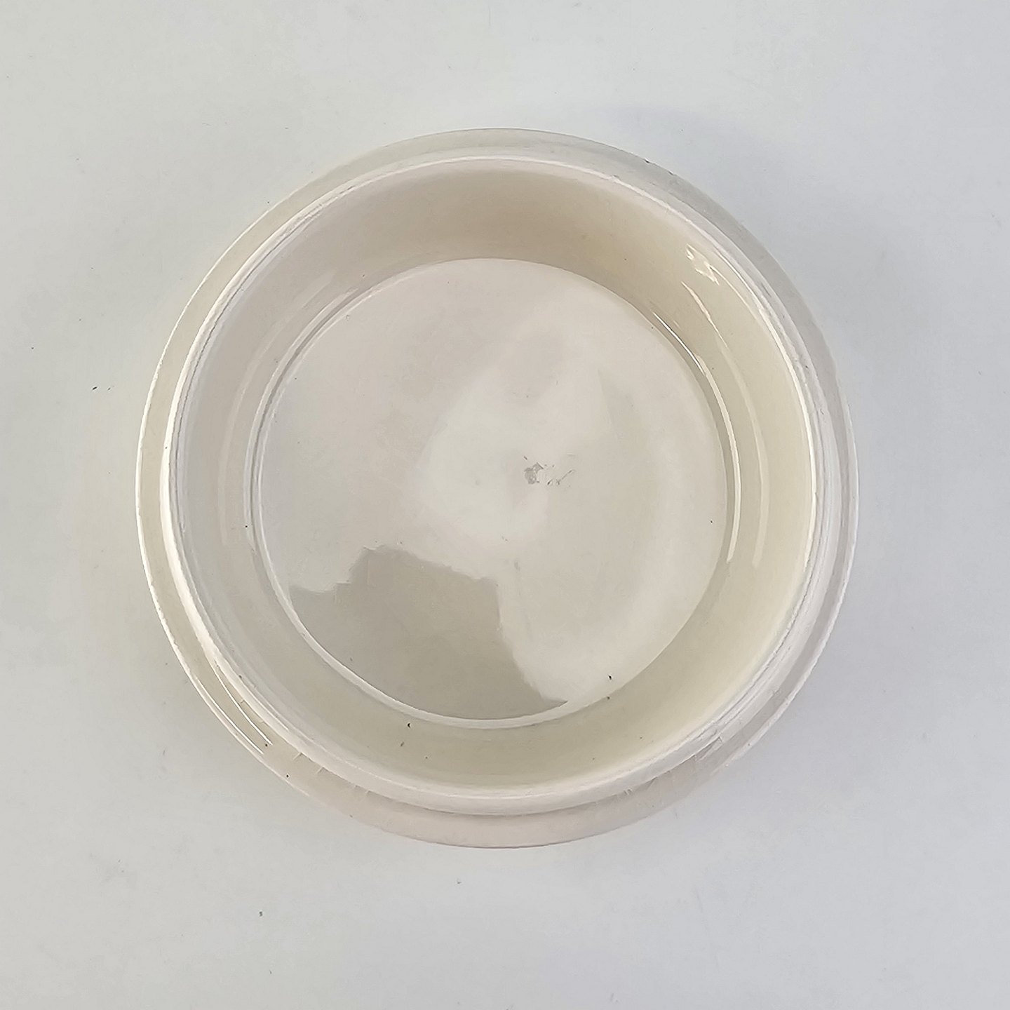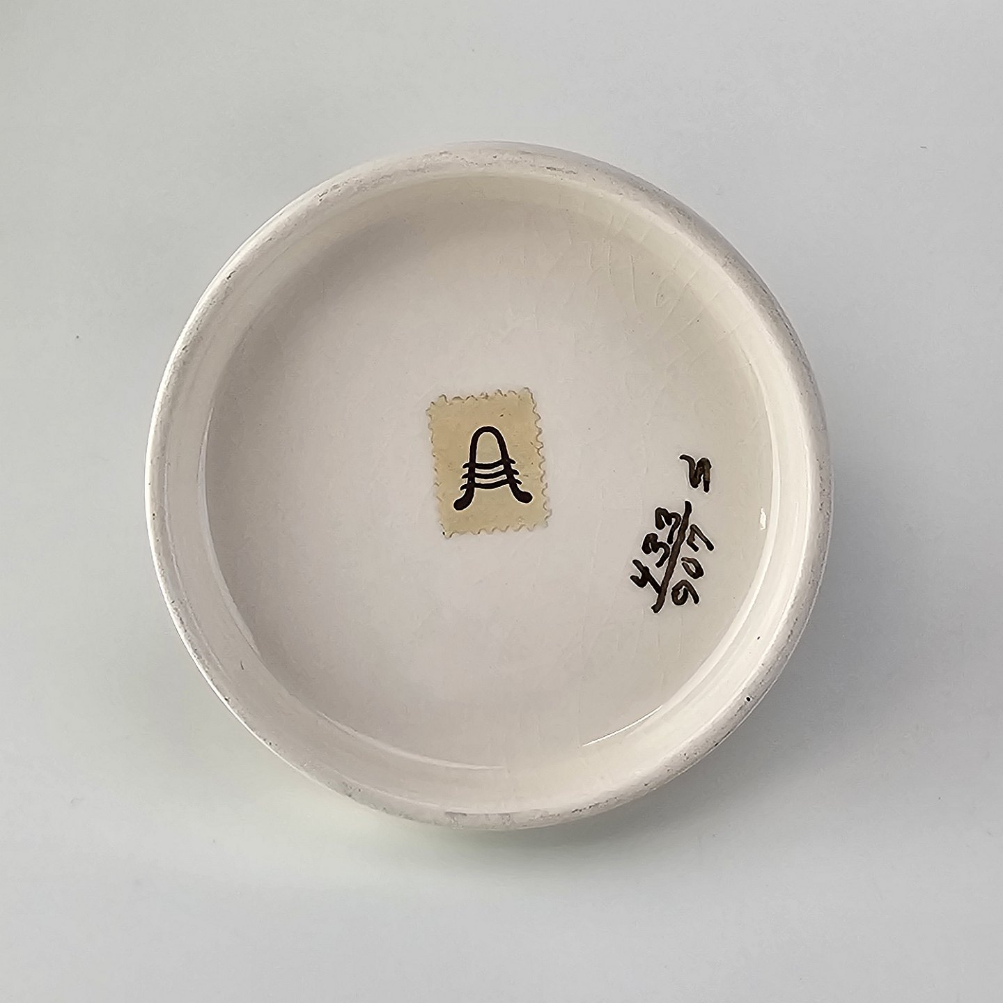 Krukke med låg i fajance med dekoration af blomster og en figur af en faun på låget