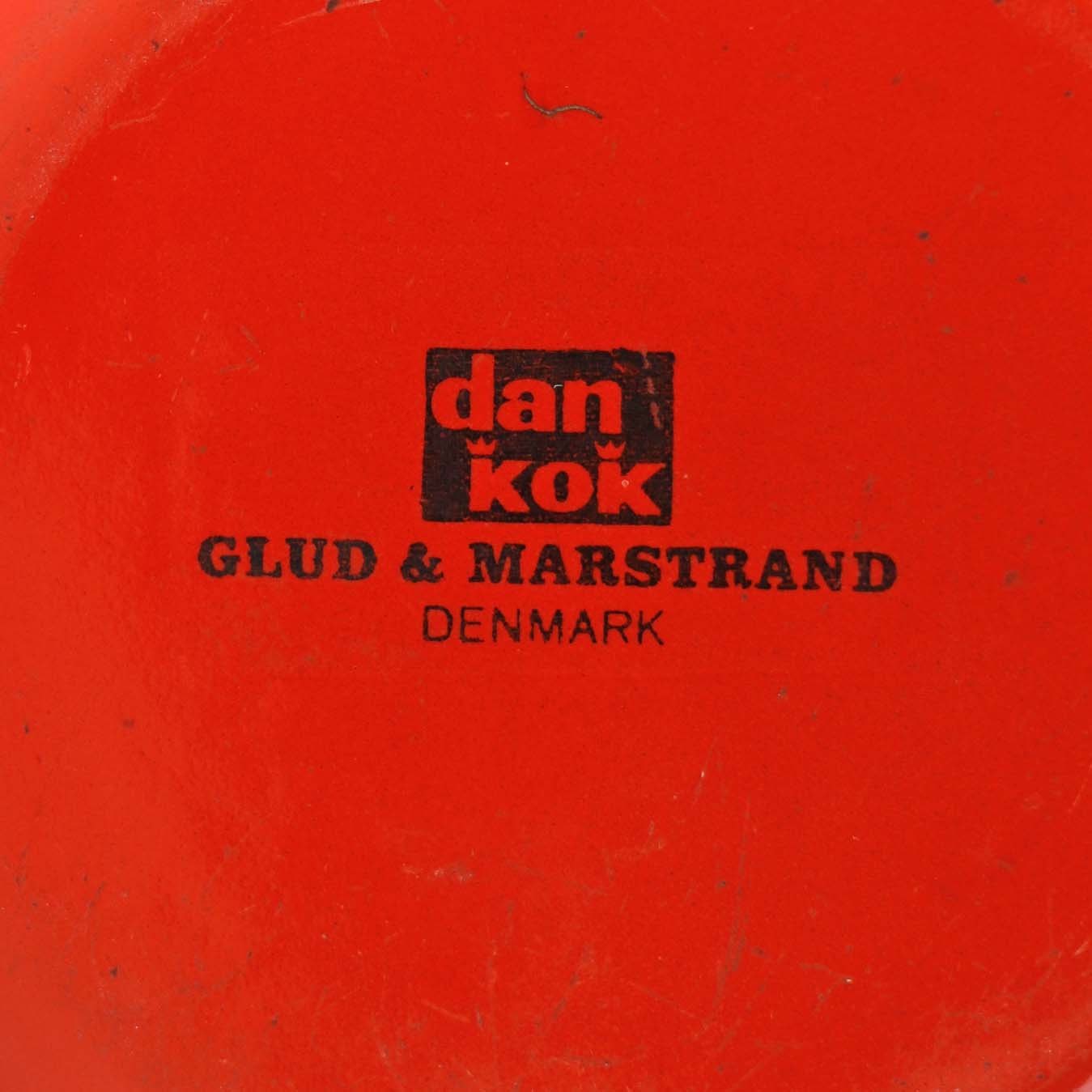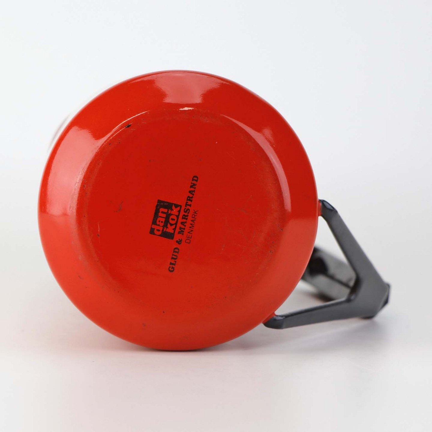 Dankok kande i metal belagt med rød, hvid og sort emalje og mønster af sorter tretakket kroner. Del af hanken er omgivet af sort plast.