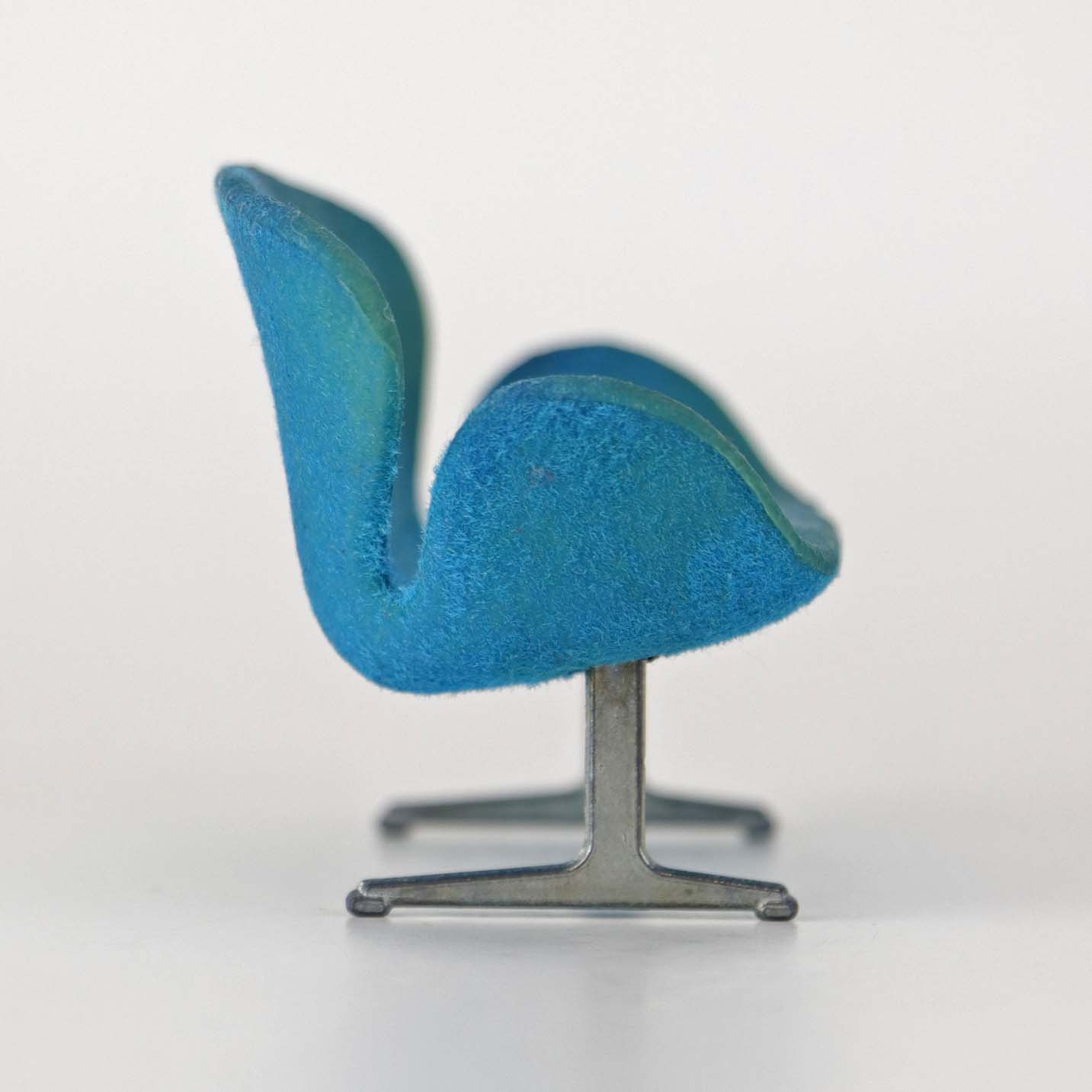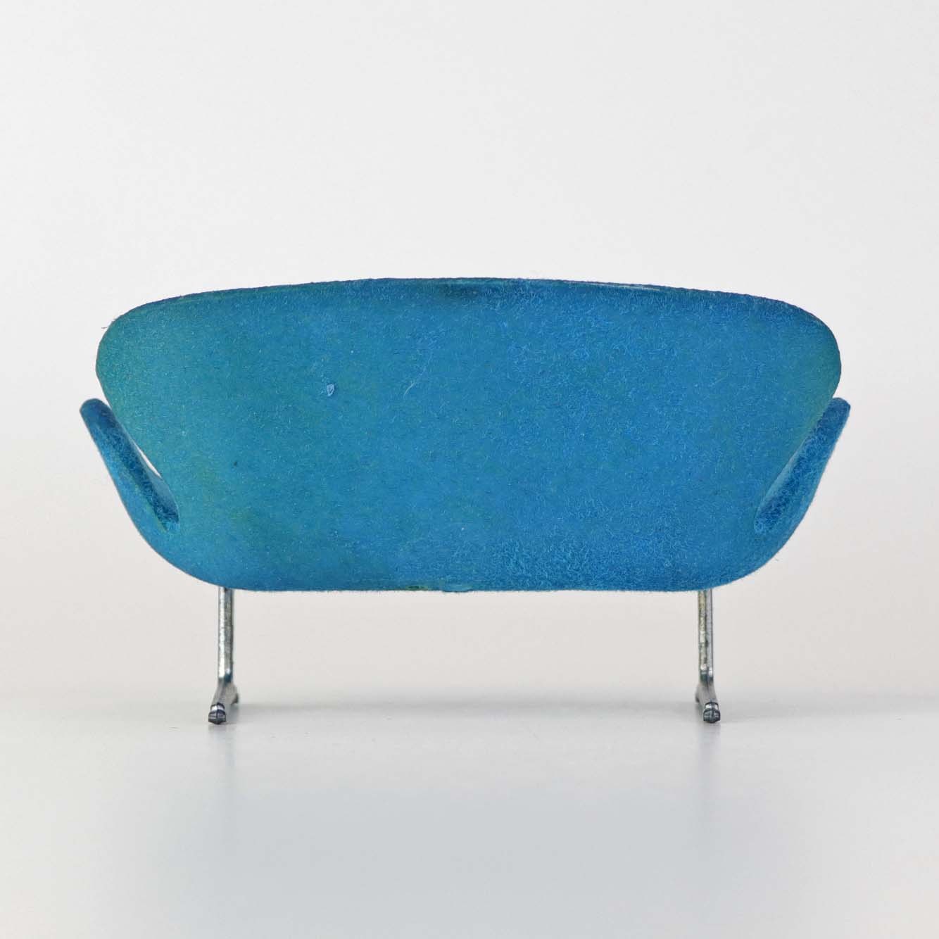 Miniature designermøbel til dukkehus med model af Arne Jacobsen's Svanesofa i blå farve med stel i metal.