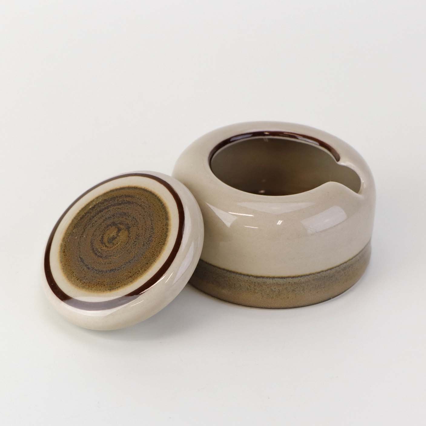 Stellet Peru er af stentøj, glaseret med lys sandfarve og dekoreret med bånd af grøn/brunlige farve