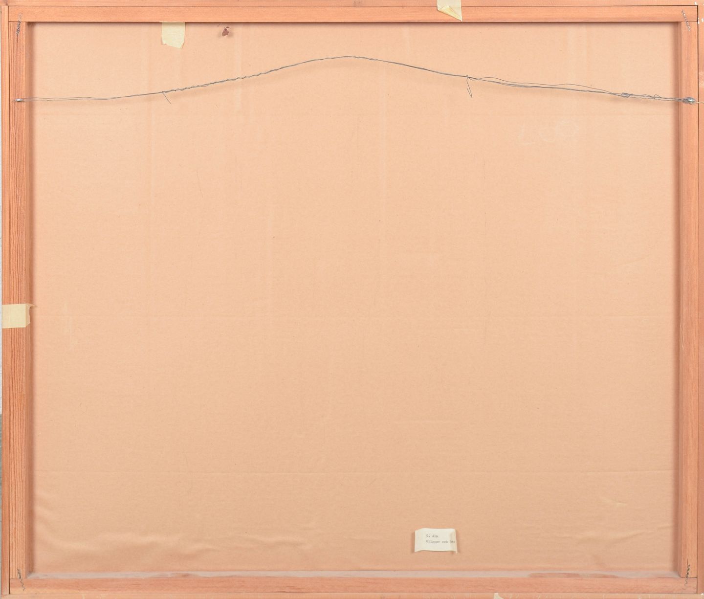 Ekspressivt kystmotiv fra den svenske skærgård med dynamiske penselstrøg og lagdelte farvefelter i blå, grønne og jordede nuancer. Kompositionen er udført i mixed media på plade og fremstår signeret og dateret 1969.