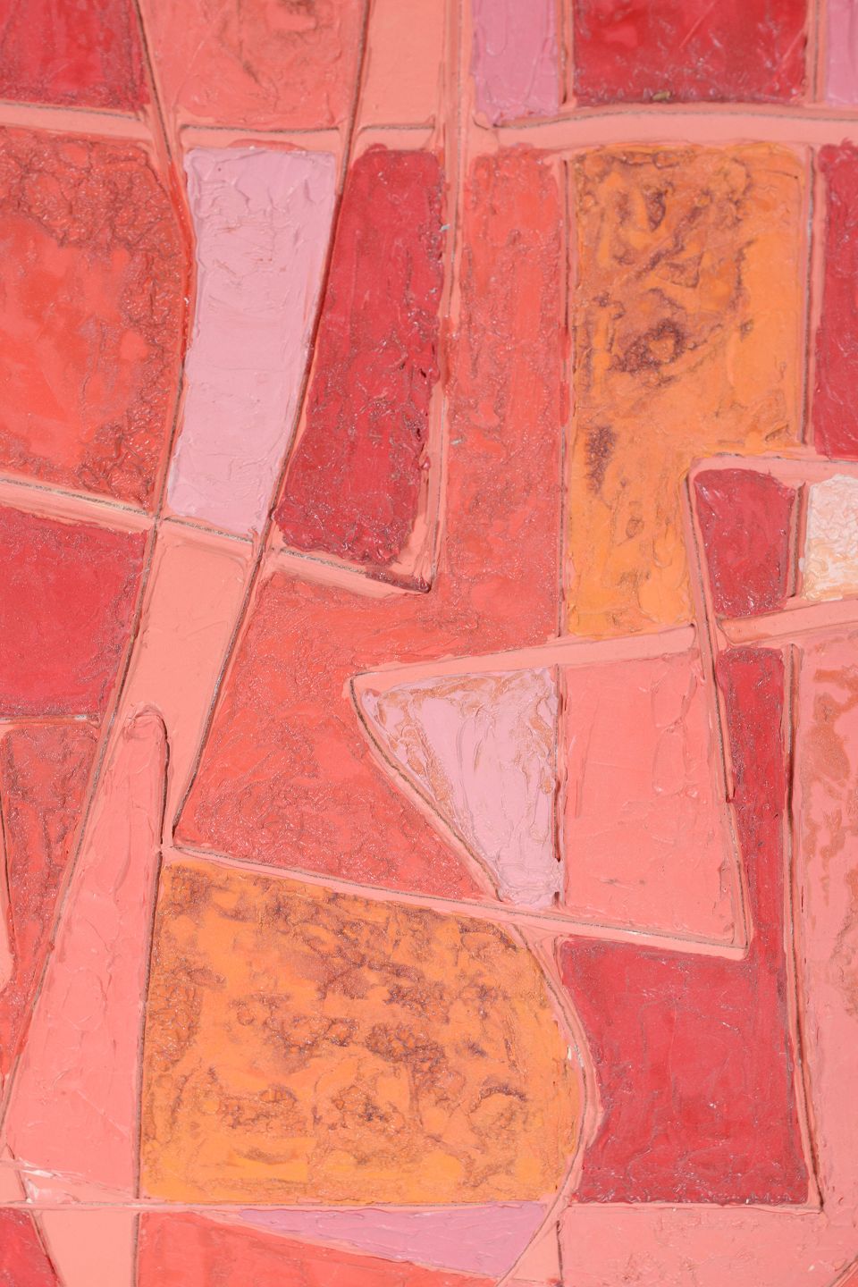 Abstrakt ekspressiv komposition opbygget i et mosaiklignende formsprog med varme røde og rosa nuancer, hvor flader og rytmiske opdelinger danner et dynamisk og dekorativt helhedsindtryk. Signeret VT.