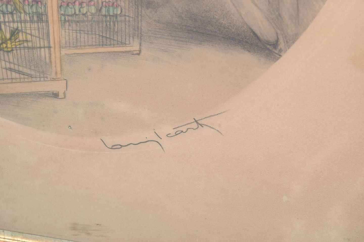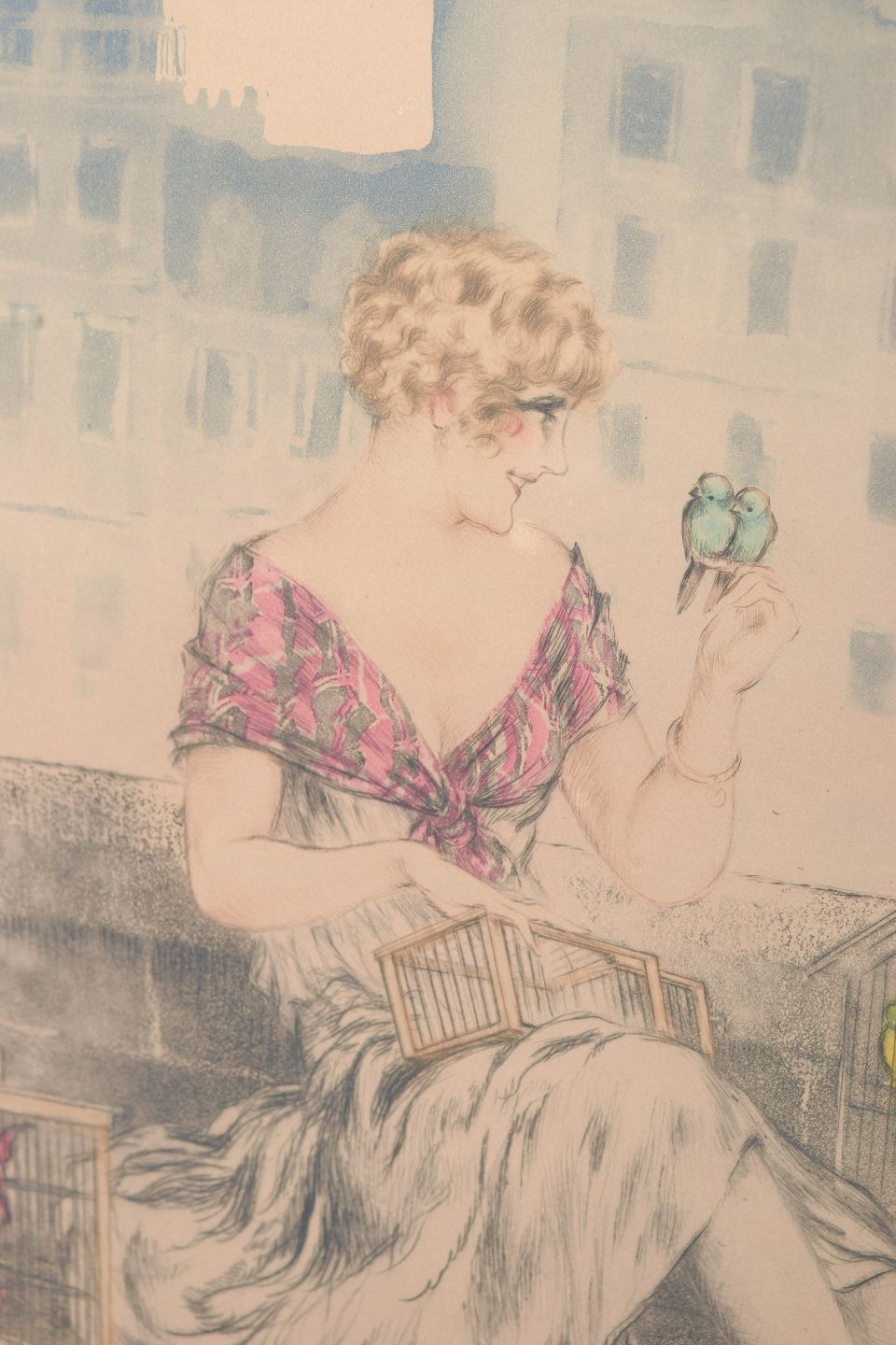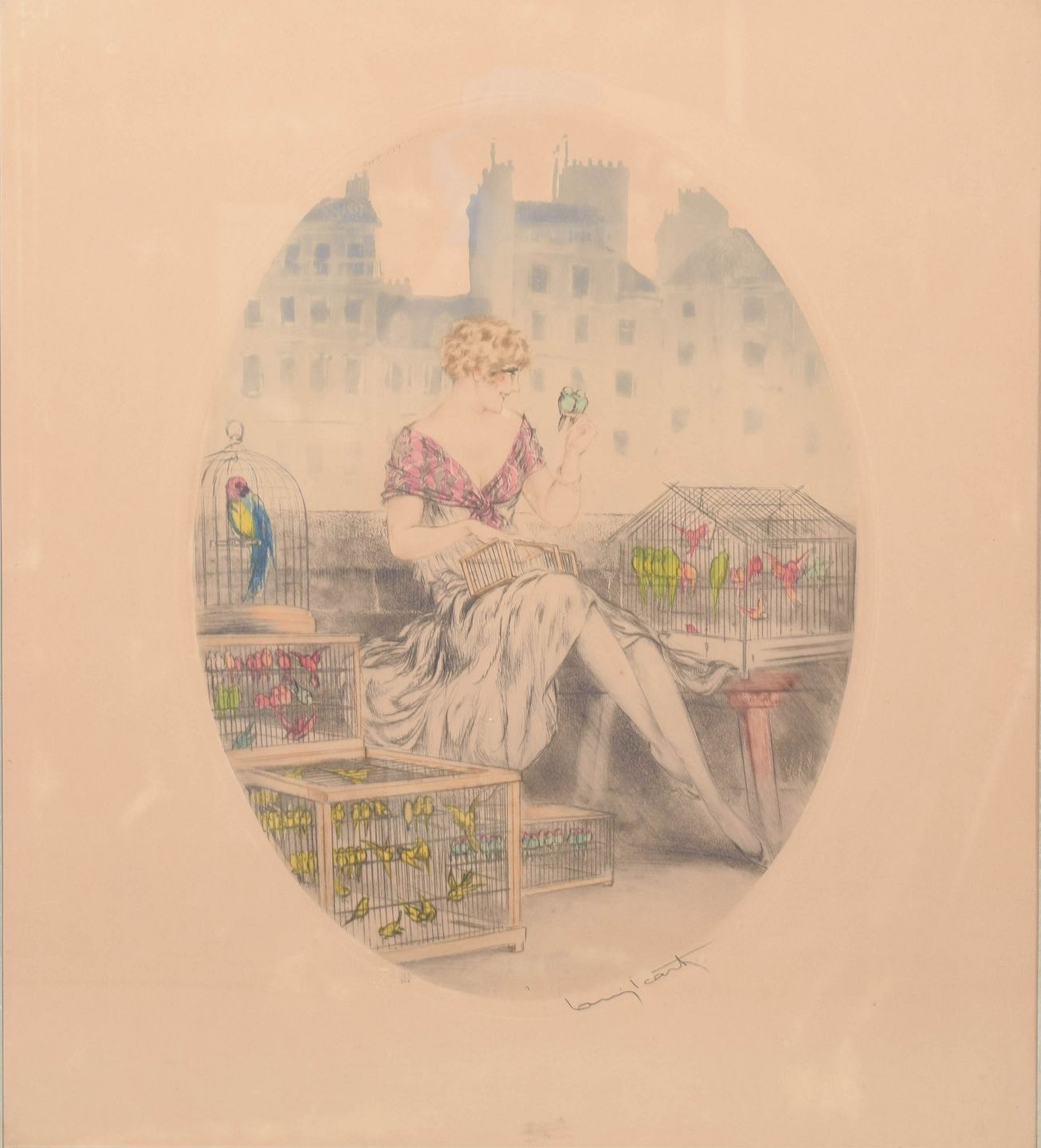 Elegant og dekorativ komposition med en siddende kvinde omgivet af fuglebure, udført i Icart’s karakteristiske Art Deco stil med fine linjer og lette farvelægninger. Signeret i blyant.