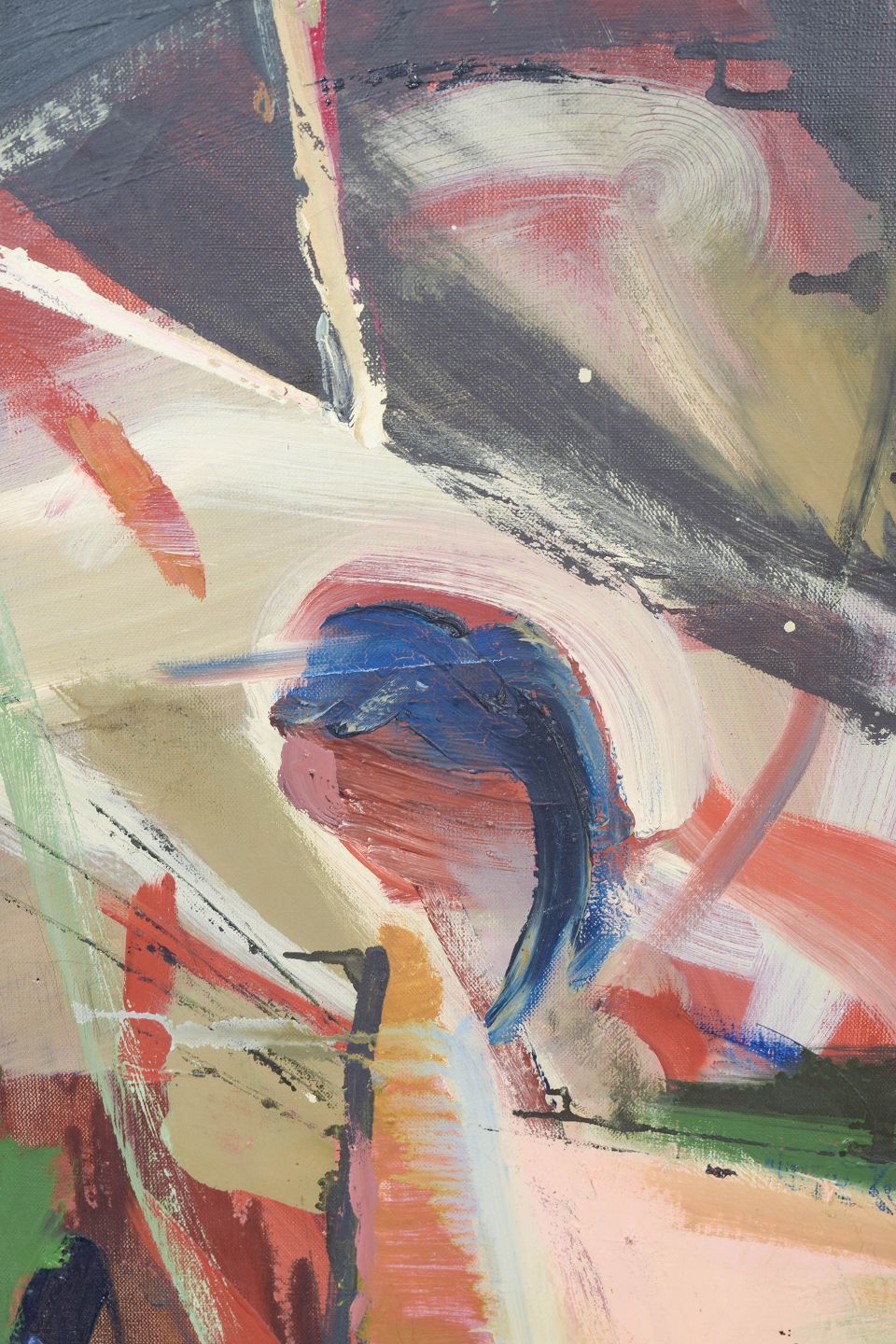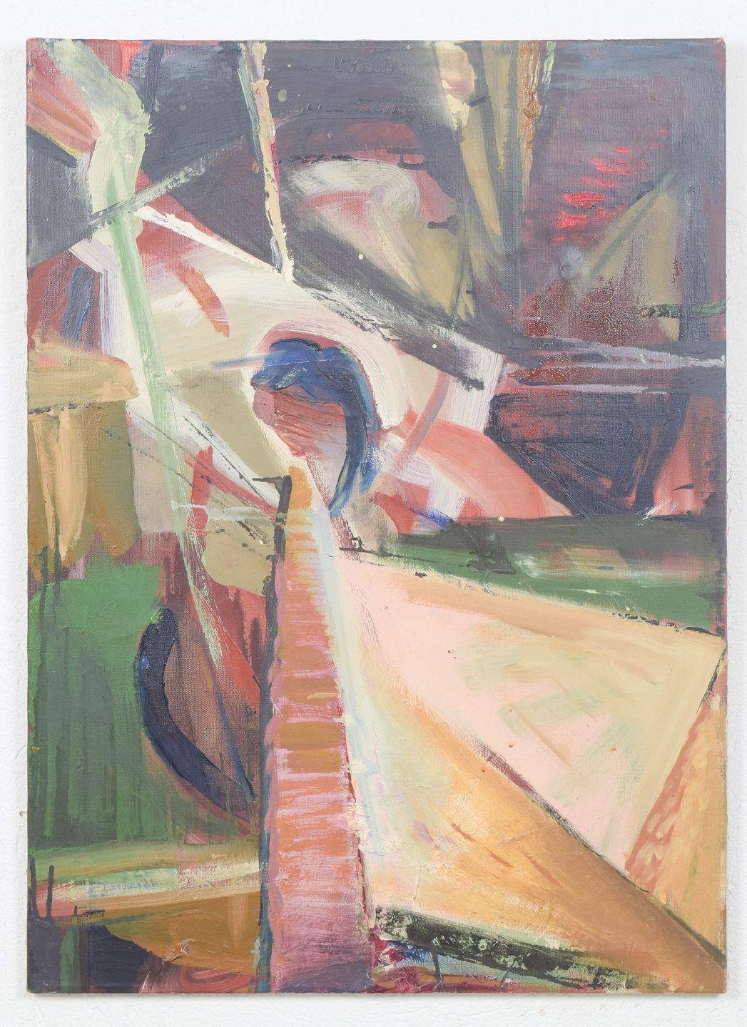 Expressive modernist composition with dynamic brushwork and fragmented geometric forms rendered in a vivid palette. The structure suggests architectural elements and spatial tension, executed with a free and gestural approach. Oil on canvas, unsigned.