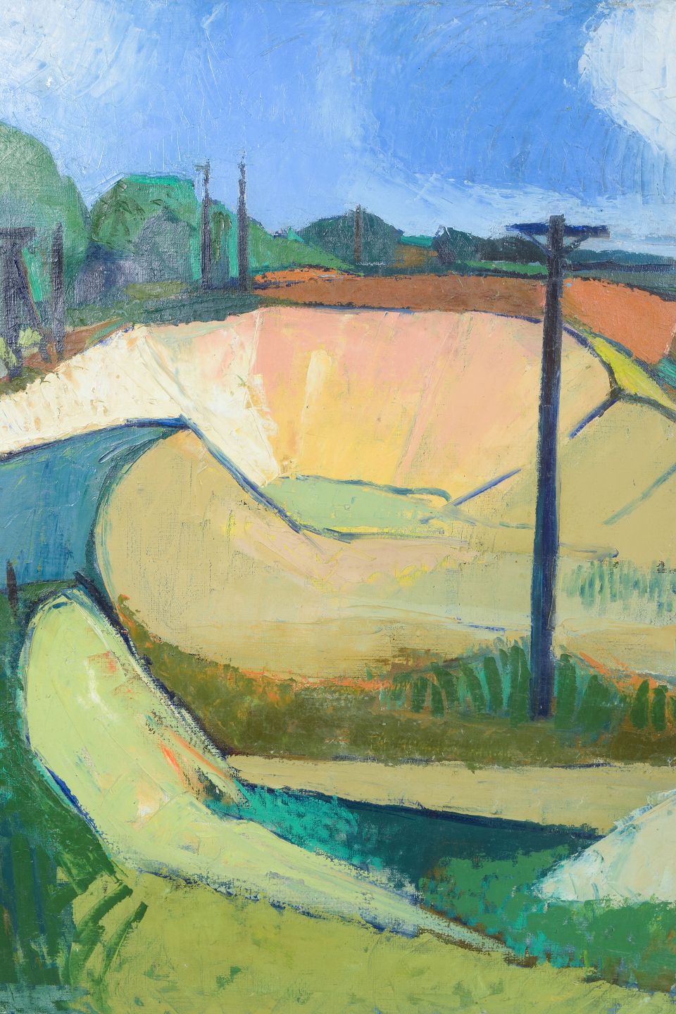 Farverigt landskabsmotiv udført i en tidlig modernistisk stil med bløde, organiske former og forenklede flader. Kompositionen er præget af en lyrisk tilgang til naturen med marker, bakker og telegrafpæle gengivet i en dekorativ og næsten abstraheret form. Udført i olie på lærred, usigneret.