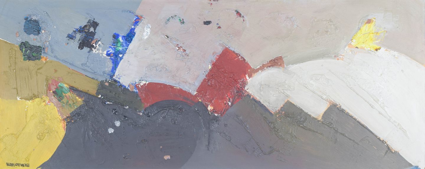 Abstrakt komposition udført i olie på plade med brede, organiske farvefelter og en afdæmpet, jordnær farvepalette. Kompositionen fremstår med en balanceret opbygning mellem mørke og lyse partier, typisk for midten af det 20. århundredes nordiske modernisme.