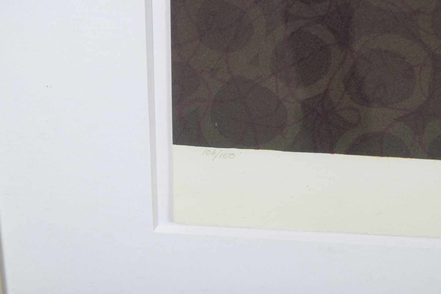 Abstrakt komposition med svævende organiske former og dekorative elementer i bløde farveovergange, udført som farvelitografi, signeret og nummereret 106/150, dateret 1995.