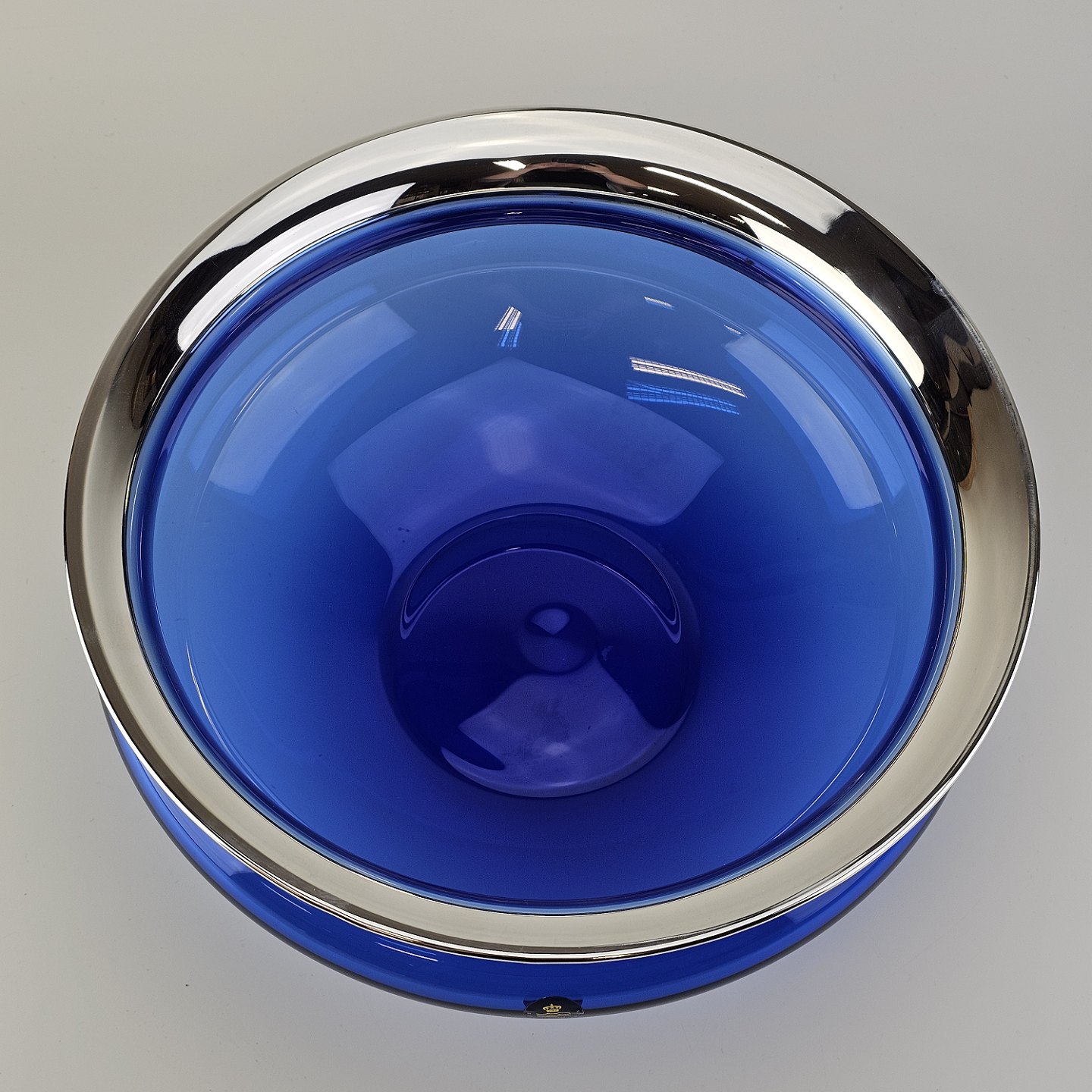 Mundblæst skål i blåt krystalglas med kant dyppet i sølv, fra serien Saturn