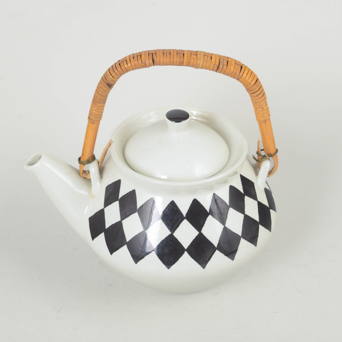 Klassisk tekande i porcelæn med karakteristisk sort rudemønster og buet hank i flettet rør, et markant eksempel på svensk funktionalistisk design fra perioden.