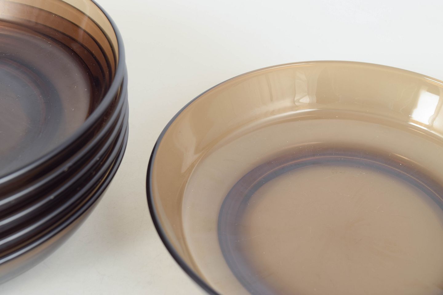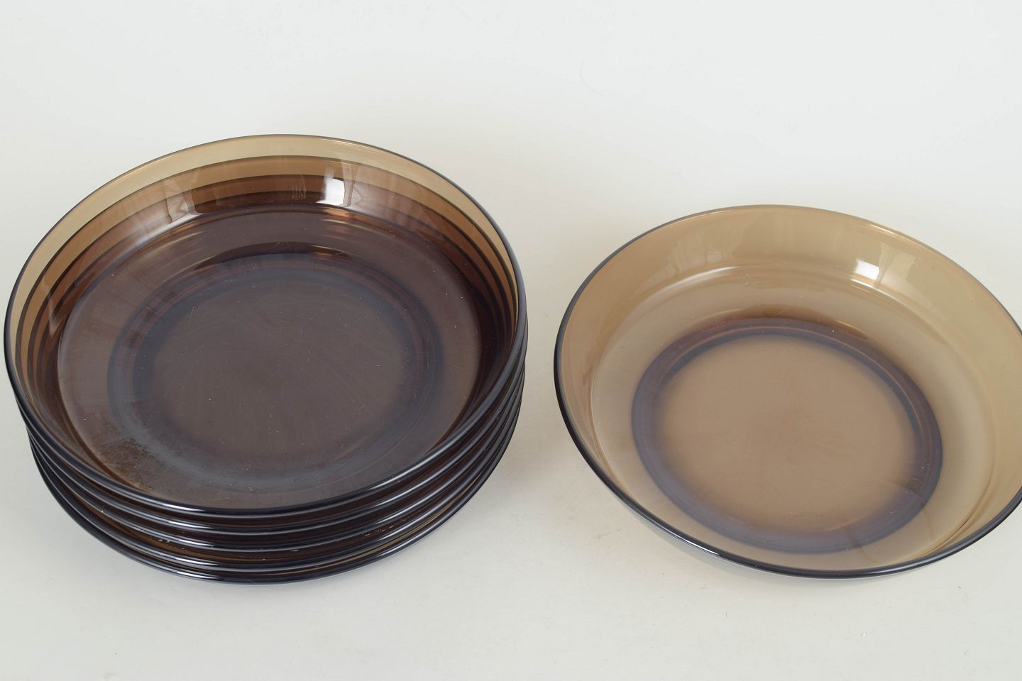 Seks dybe tallerkener i presset glas med lav, bred form og røgfarvet toning, fremstillet i Frankrig og mærket fra producenten.