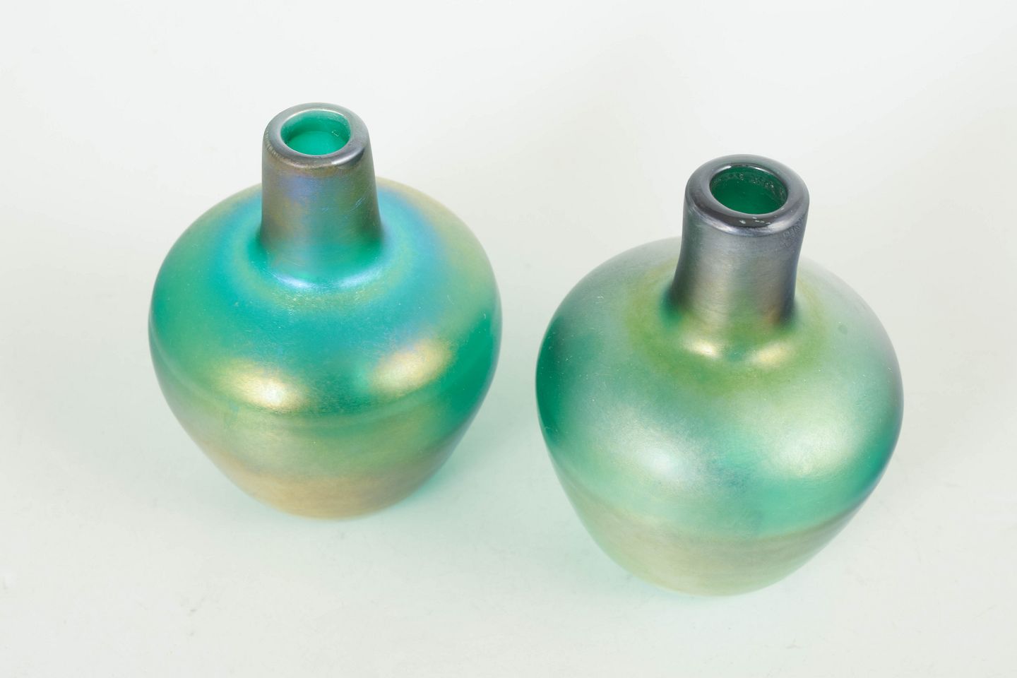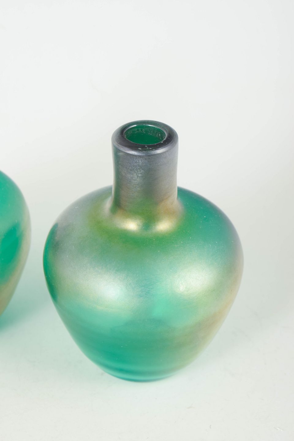 Elegante mundblæste glasvaser med organisk form og iriserende overflade i grønne og gyldne nuancer, der skifter i lyset.