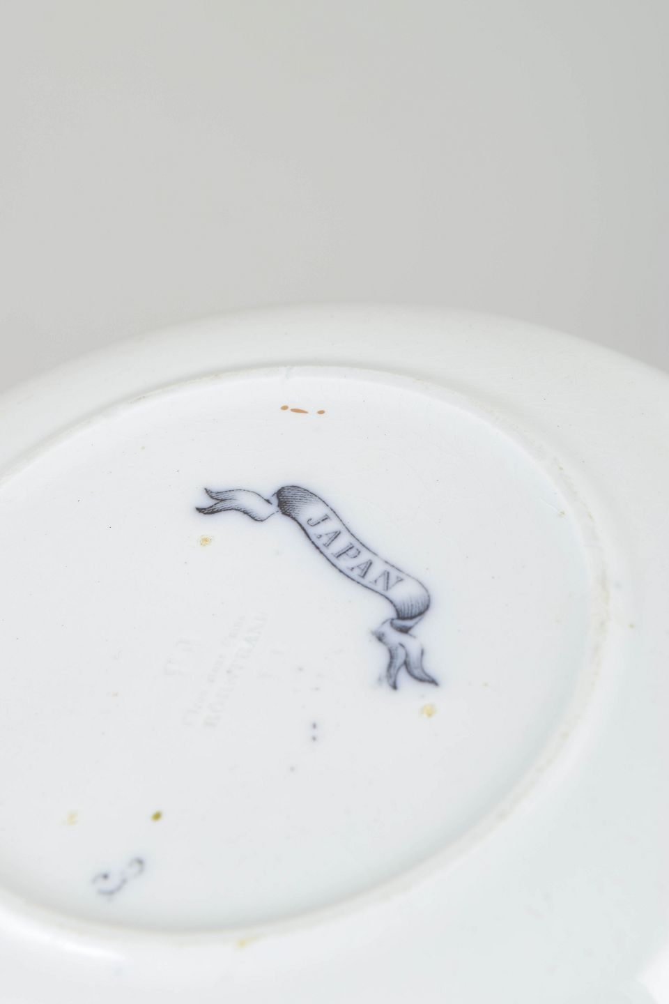 Store kopper i fajance med tilhørende underkopper, dekoreret i polykrom orientalistisk japansk stil med pagodemotiv, bygninger, fugl og blomster. Model Japan, produceret i perioden 1866–1925 og dateret til 1880’erne.