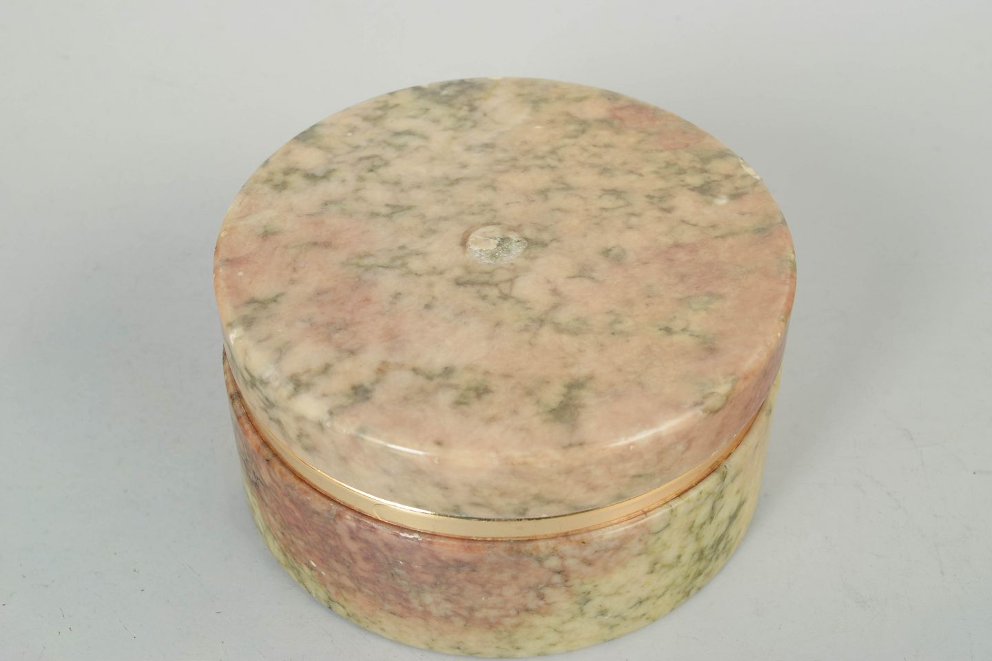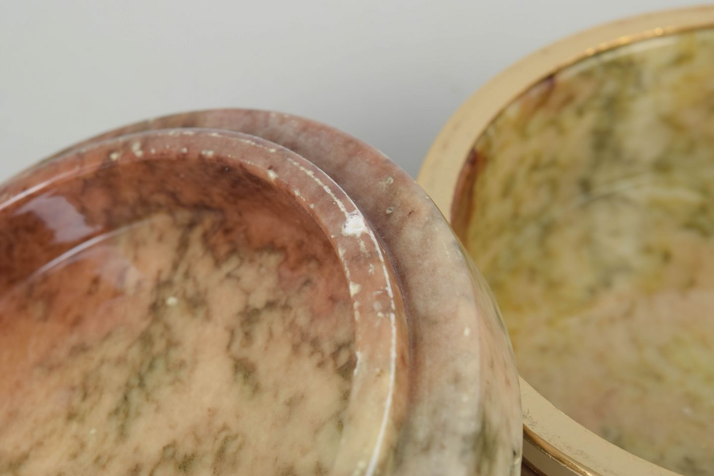 Rund æske med låg udført i alabast med smukt flerfarvet åretegning i rosa, grønne og beige nuancer. Afsluttet med et fint bånd i messing, der tilfører et raffineret art deco præg.