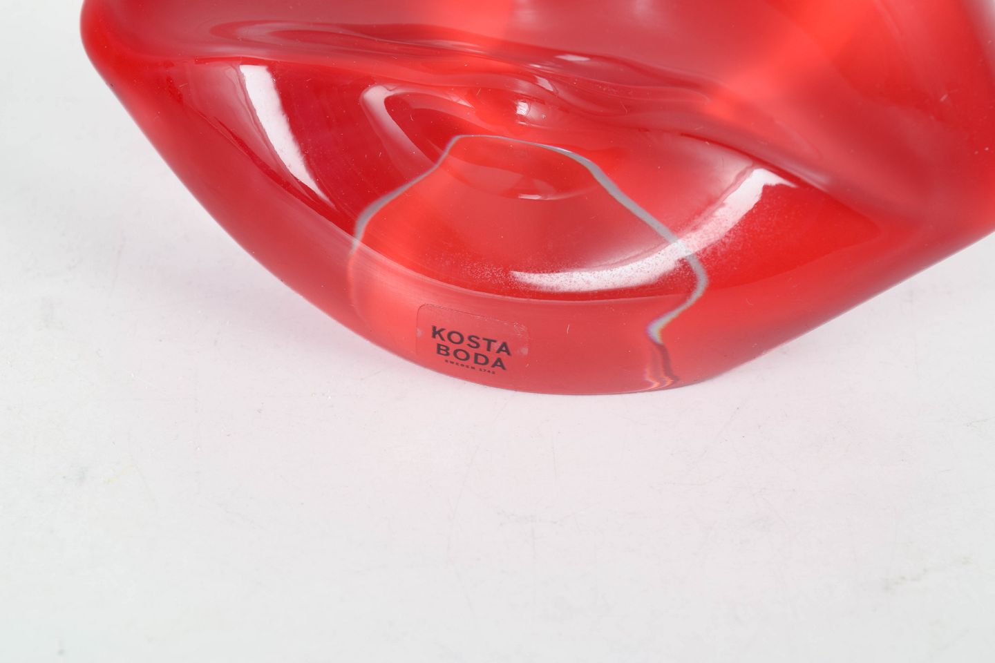 Sculptural lip-shaped form executed in solid red glass with soft organic lines and a transparent effect.