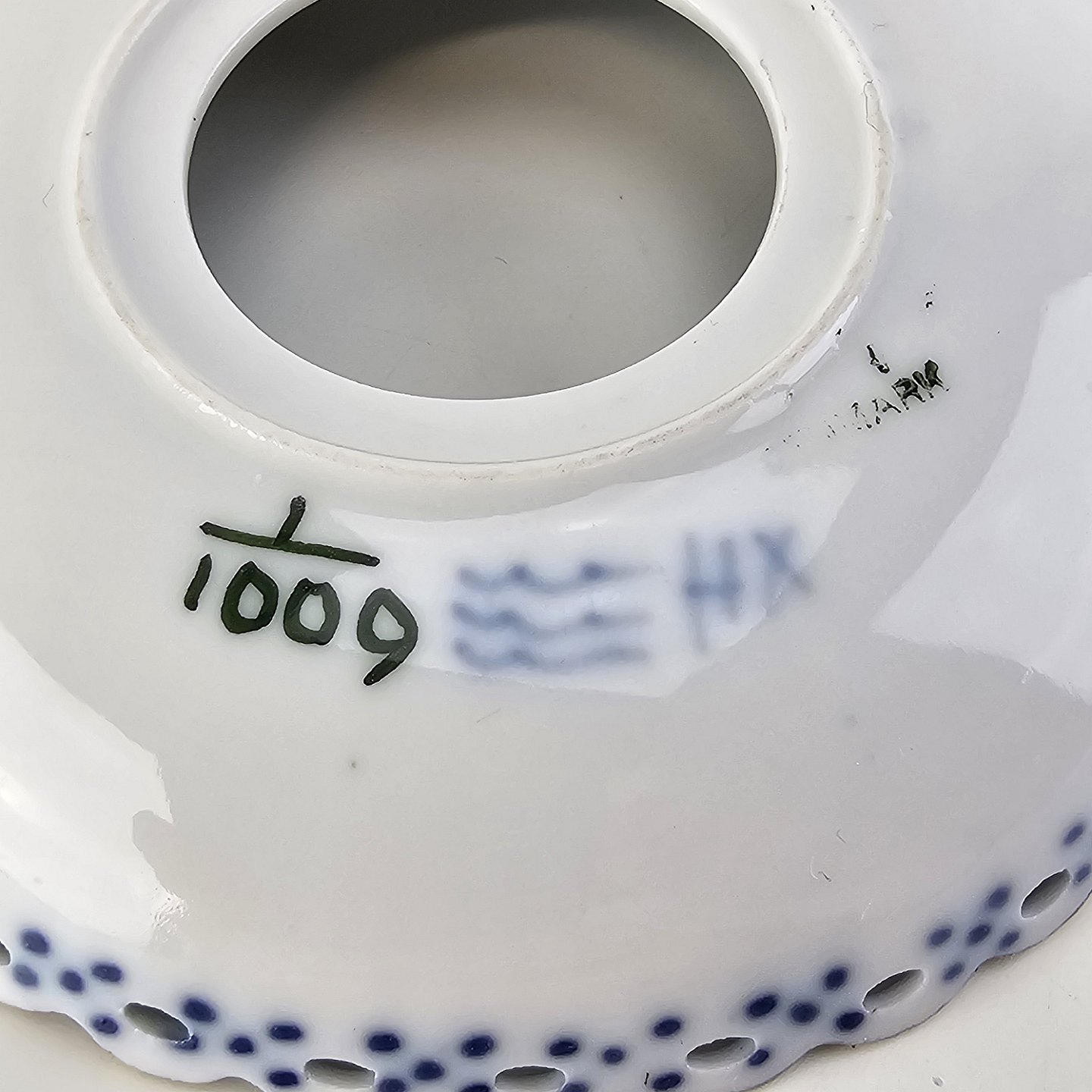 Musselmalet helblonde er riflet hvidt porcelæn med dekoration af blå ranker og en kant med blonder.