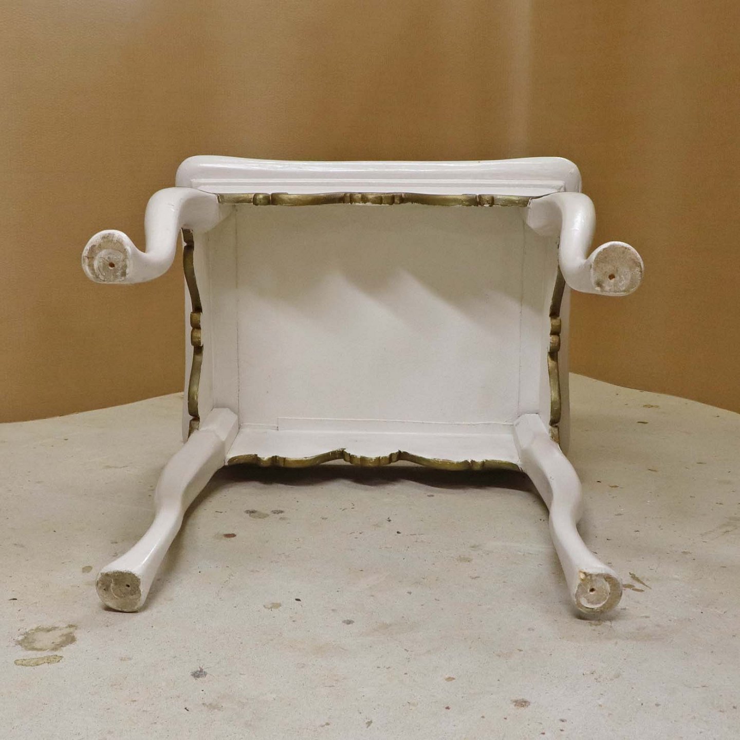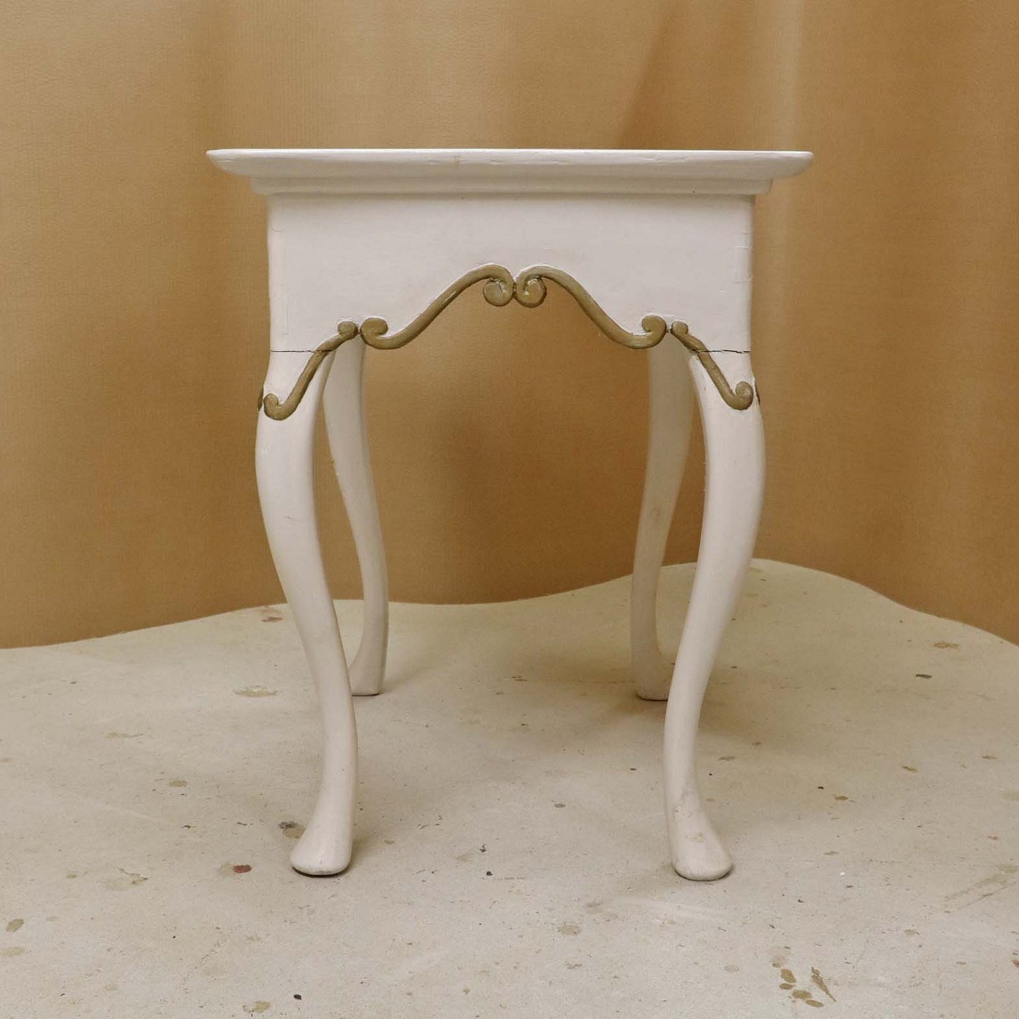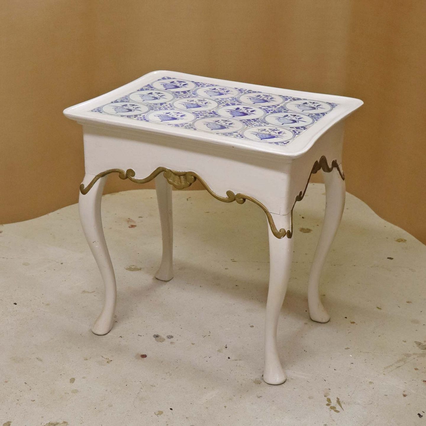 Antik hollandsk entrebord med svungne ben fra 1800-tallet i hvidmalet træ med guldmalet mønster og håndmalede delft kakler i blå streng med motiv af blomsterkrukker (Blumenpot) og hjørnedekoration i Wan Li stil.