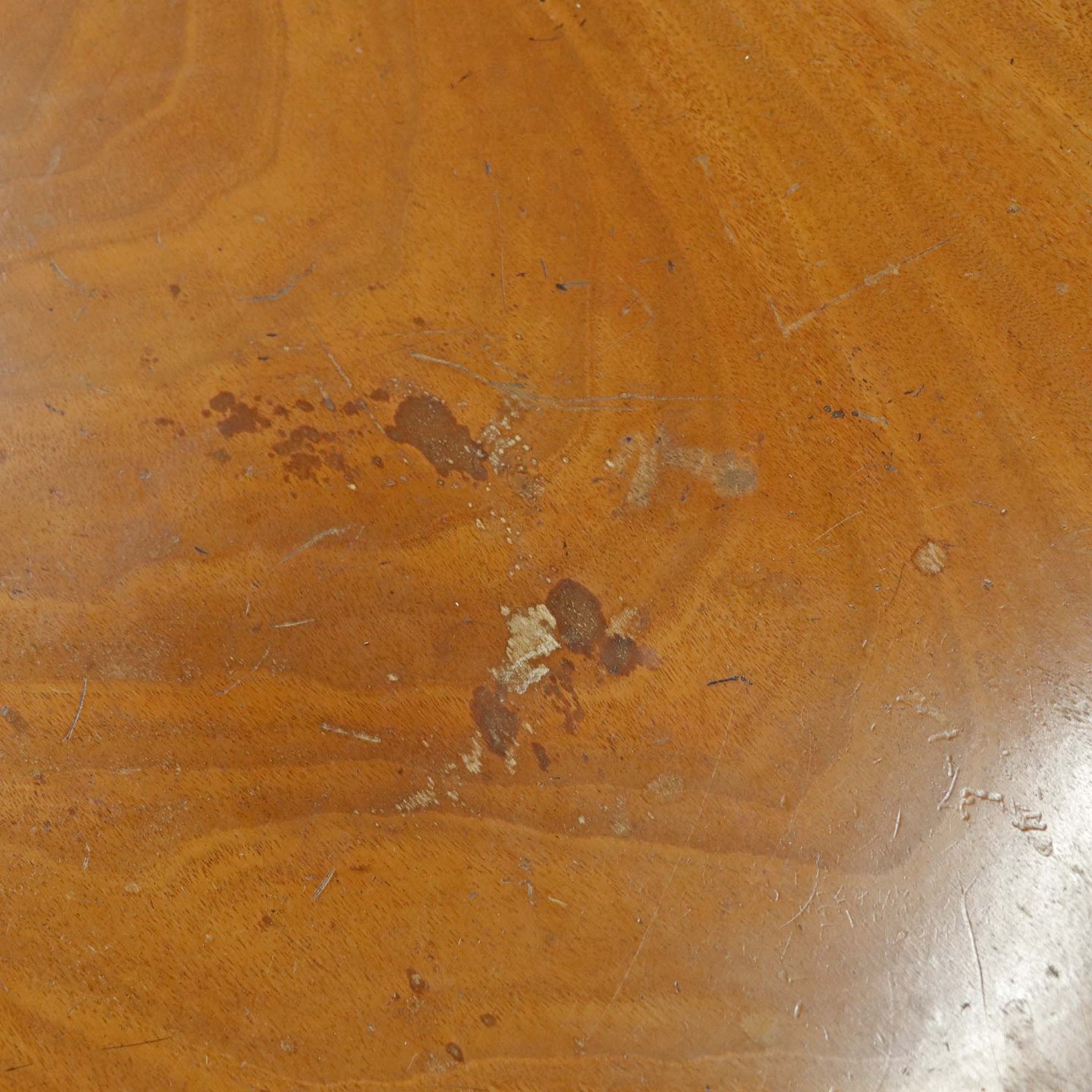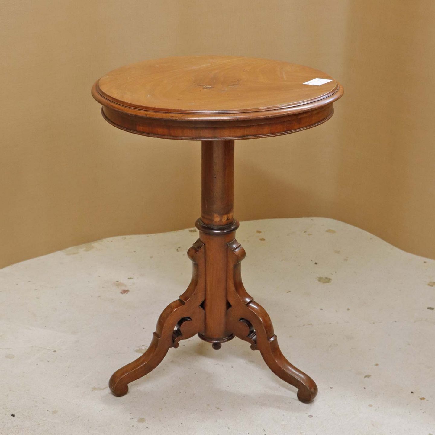 Et ældre serveringsbord på tre fødder i lakeret maghoni med tre etager. Opsatsdelen kan slås sammen til et bord.