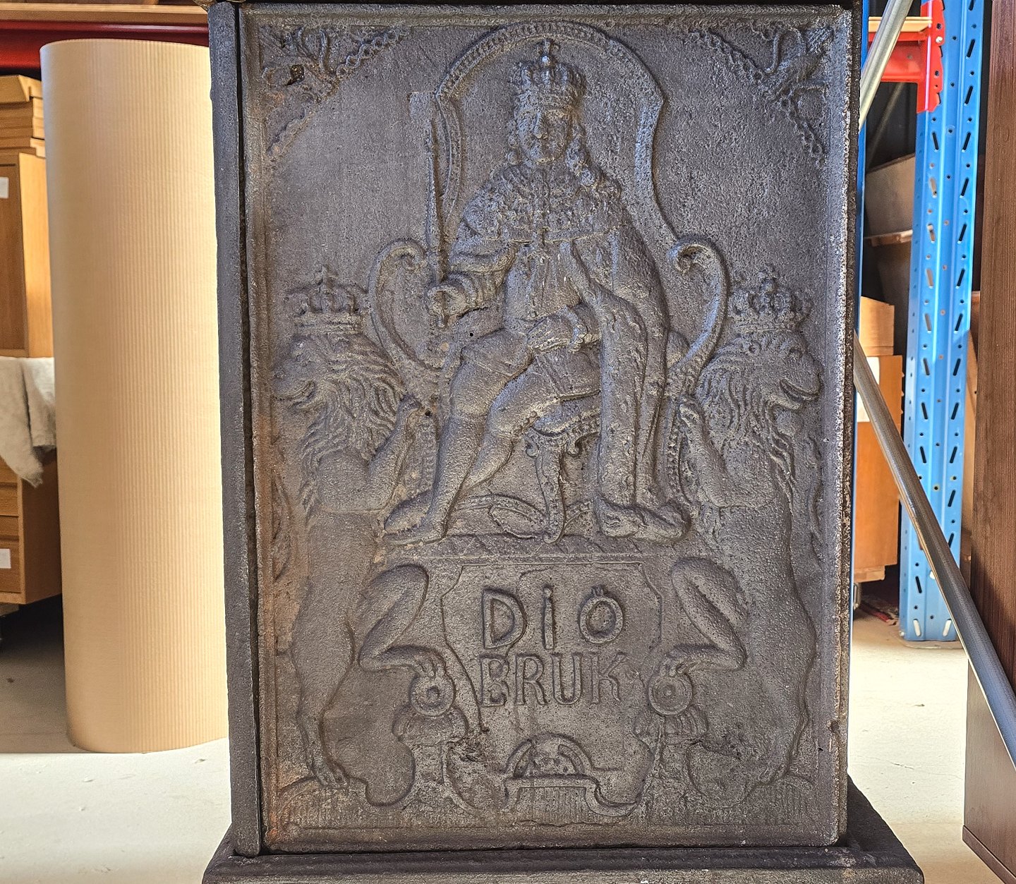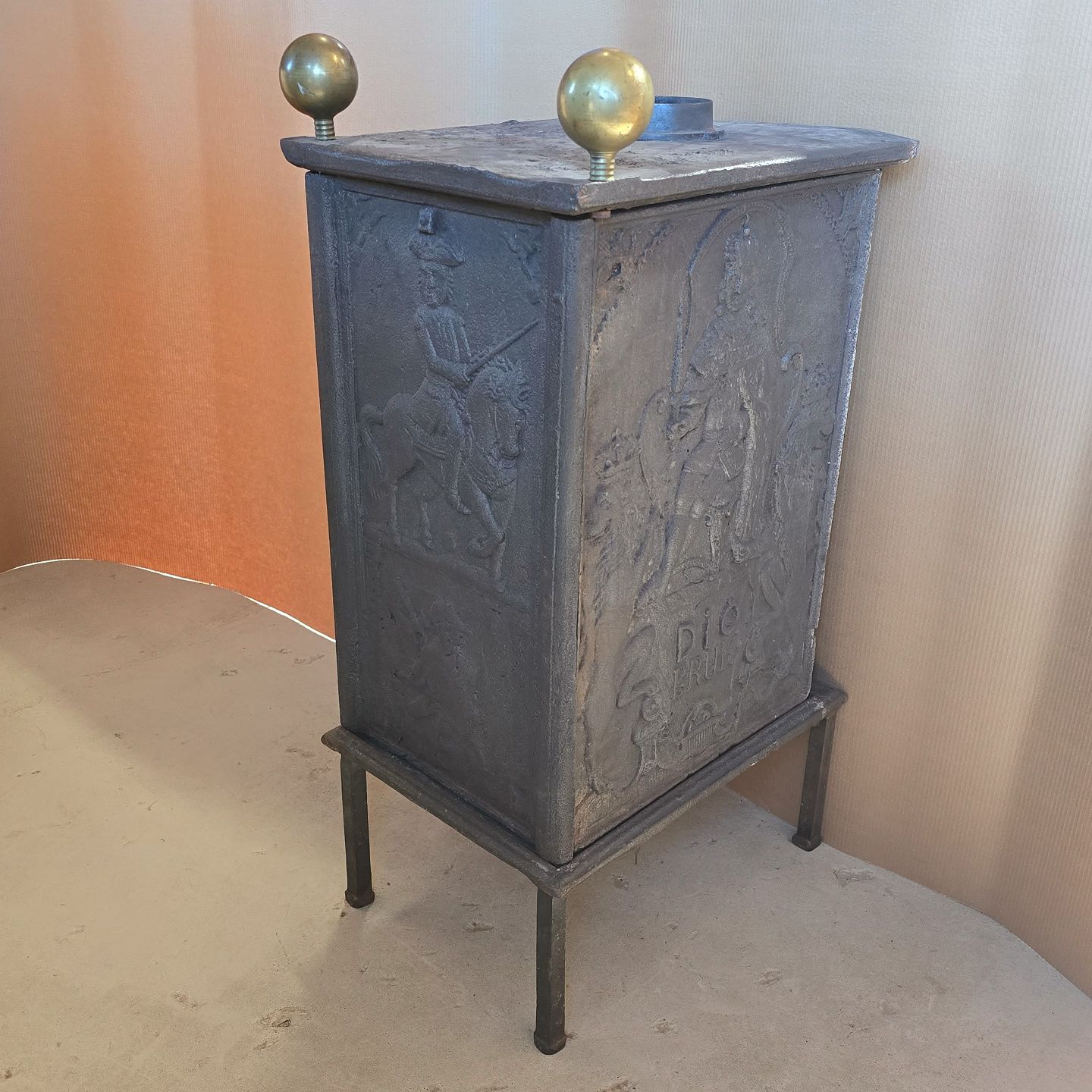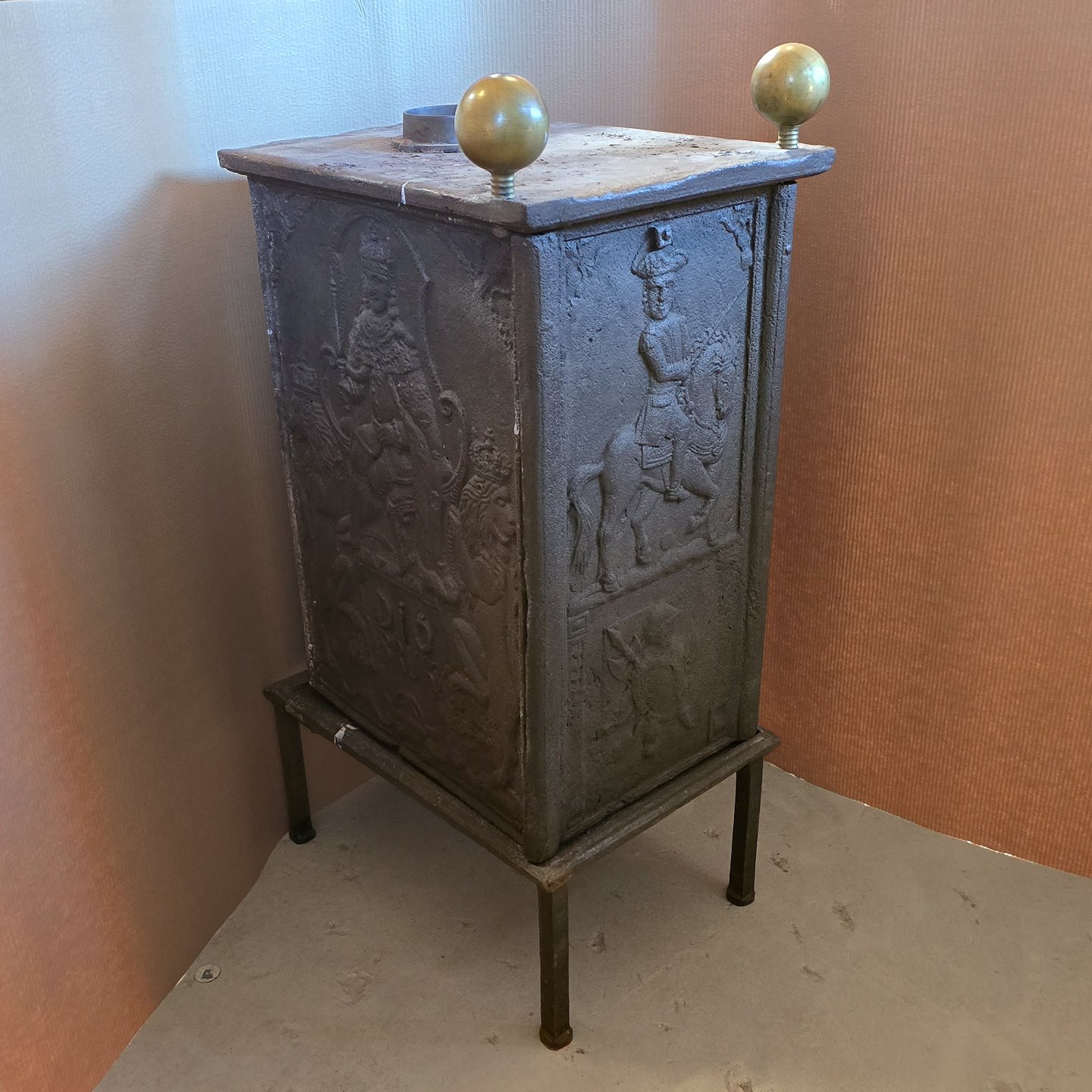 Antik svensk bilæggerovn i støbejern fremstillet i perioden år 1750-1800. Ovnen er dekoreret med motiv af den svenske konge siddende på tronen omgivet af to løver samt den svenske konge til hest. Ovnen har monteret to kugler i messing på toppladen.